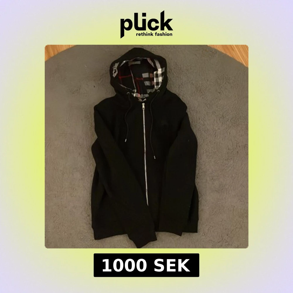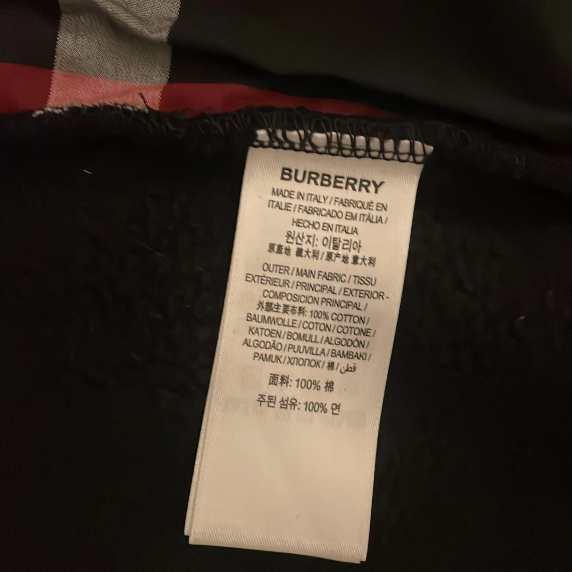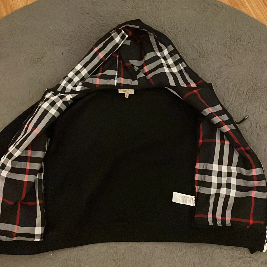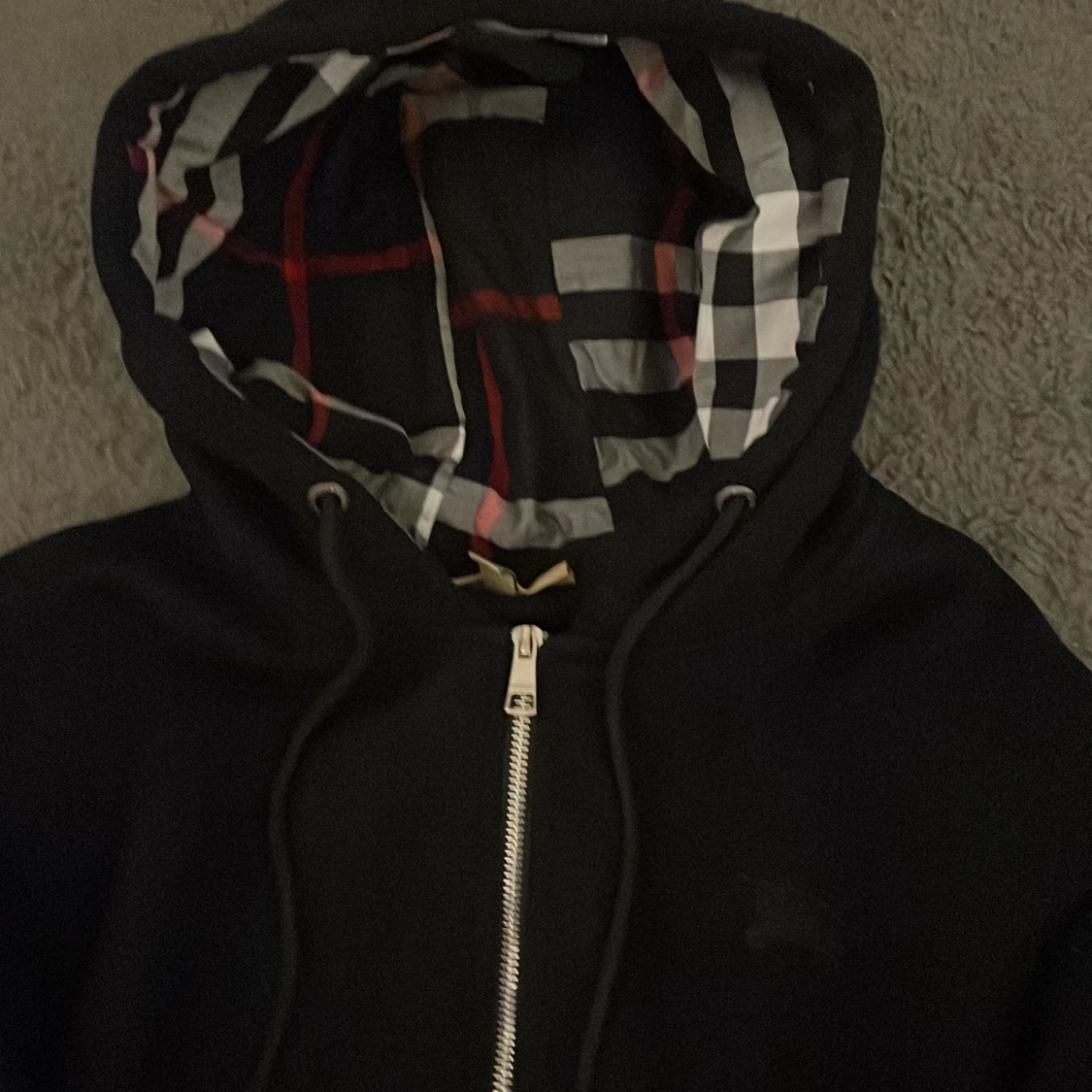 Svart hoodie från Burberry i 100% bomull med klassiskt rutigt foder i huvan. Tröjan har dragkedja framtill, snörning vid huvan och en clean look. Perfekt för dig som gillar stilrena märkesplagg med en twist.