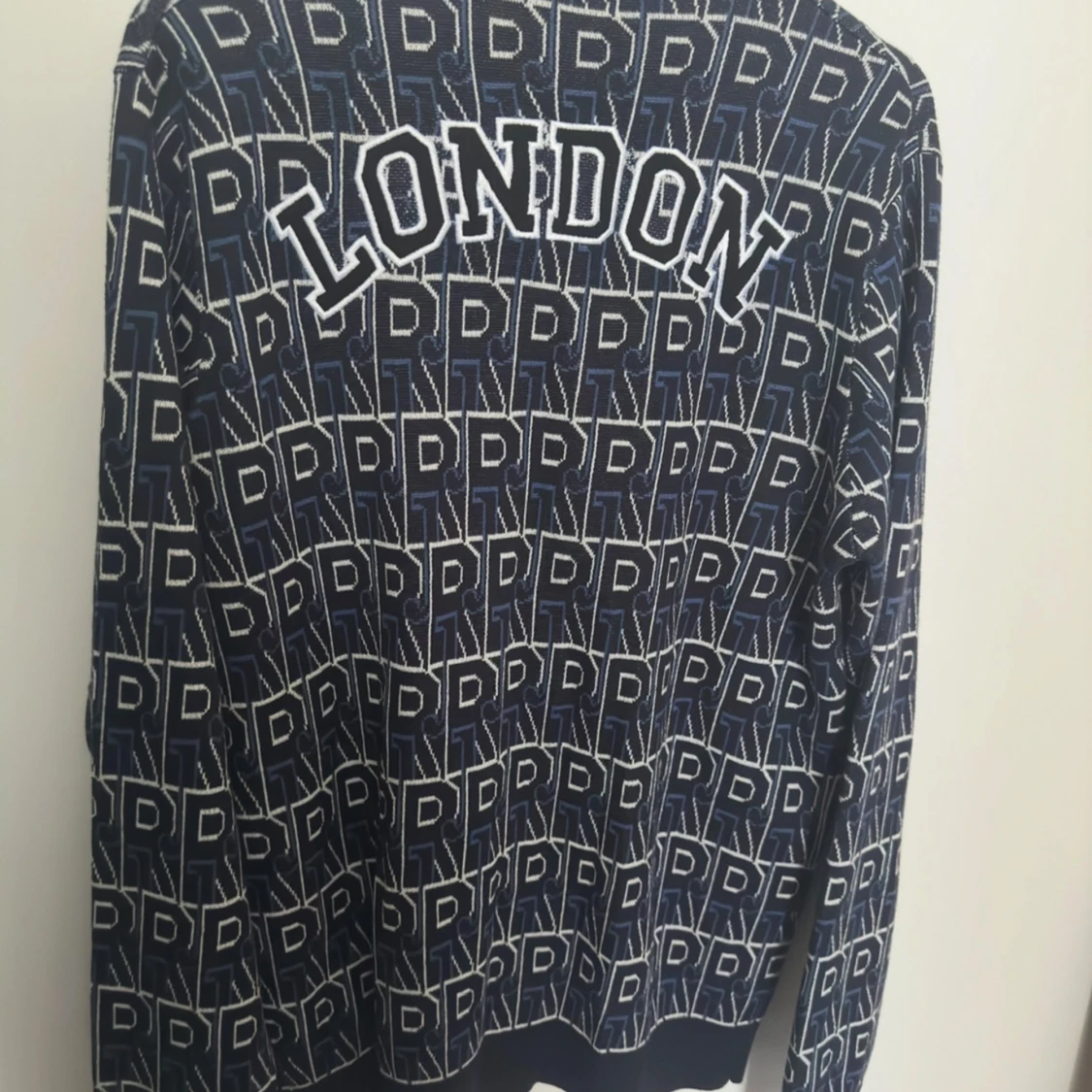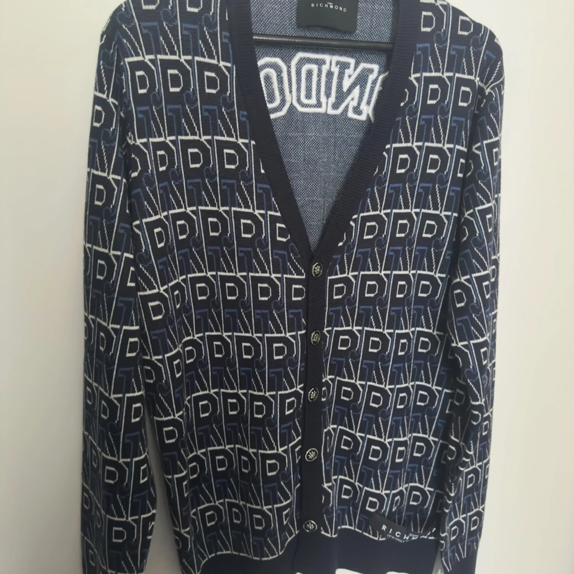 Snygg kofta från Richmond med ett unikt mönster i blått och vitt. Koftan har långa ärmar och knappar framtill. Texten 'LONDON' pryder ryggen, vilket ger en cool touch. Perfekt för dig som vill sticka ut!