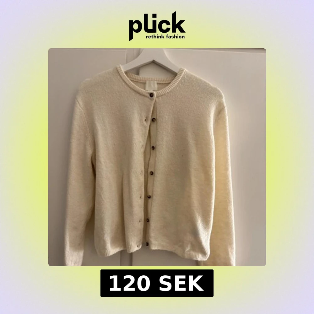 Supermjuk krämvit kofta från H&M i storlek XS. Jag skulle säga att den här koftan passar en xs-m beroende på hur man vill att den ska sitta💘 Koftan har rund halsringning, långa ärmar och knäpps med bruna knappar framtill. Väldigt enkel att styla till olika outfits.