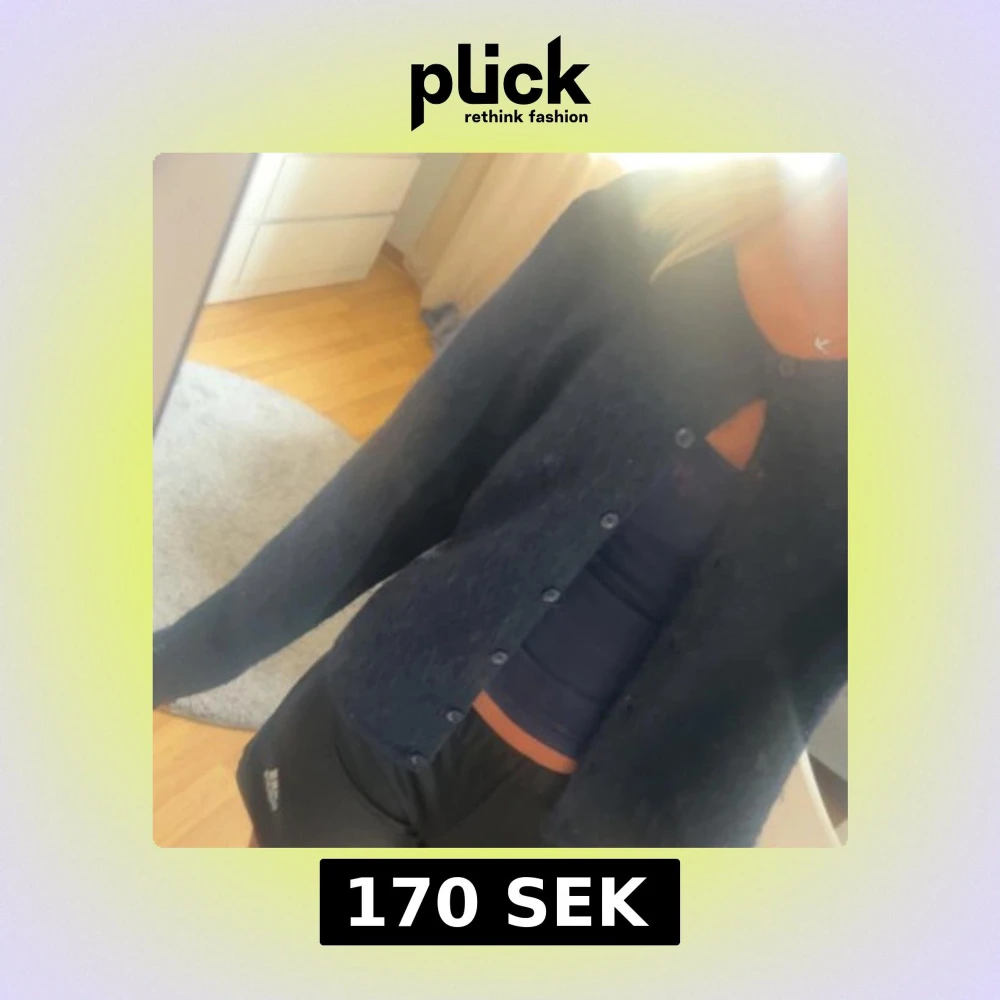 Säljer en mörkblå, mjuk och fluffig kofta från American Vintage. Koftan har rund halsringning, långa ärmar och knäpps med knappar framtill. Perfekt att slänga över en topp för en mysig look.