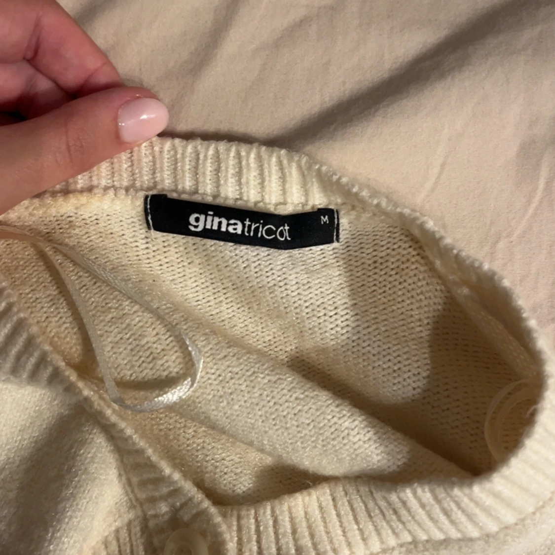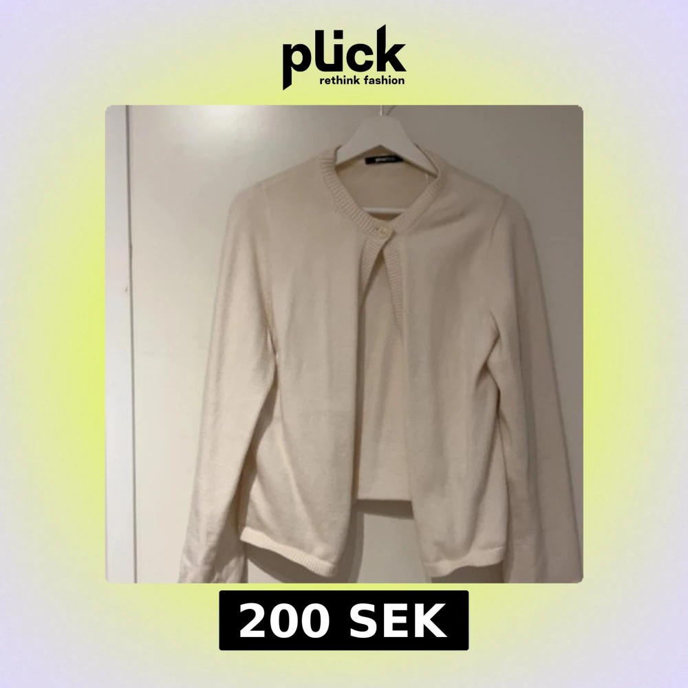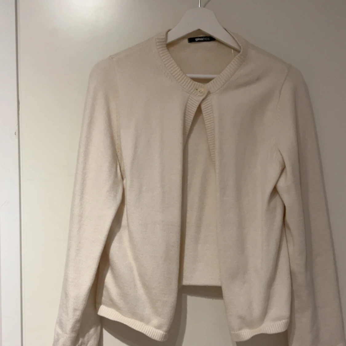 Säljer en stilren beige kofta från Gina Tricot i storlek M. Koftan är stickad med rund halsringning och knäppning upptill. Perfekt att slänga över en topp för en enkel och clean look. Använd 2-3 gånger💞