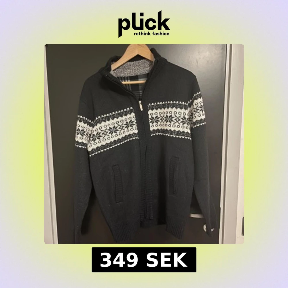 Säljer en svart stickad kofta med ett vitt mönster över bröstet och ärmarna. Koftan har dragkedja och en mysig fodrad insida i rutigt mönster. Perfekt för kyliga dagar! Väldigt fin passform!