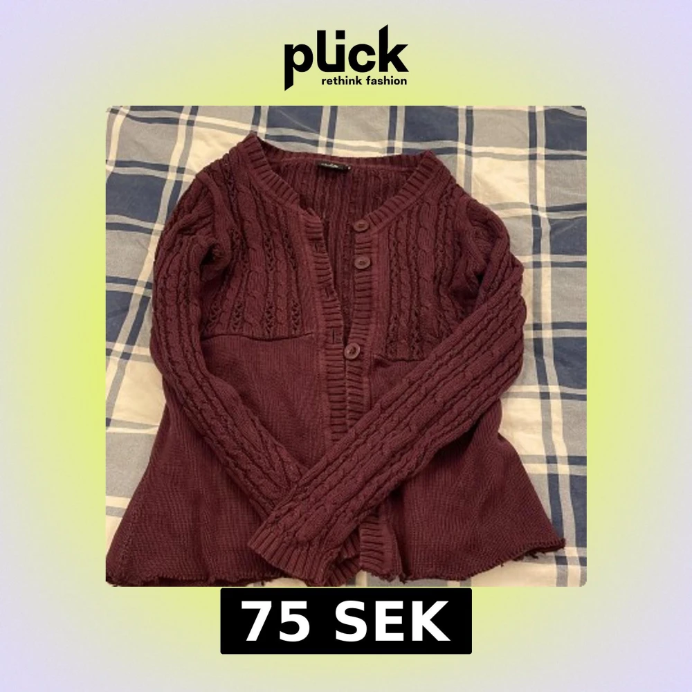 Mysig vinröd kofta från Isolde med kabelstickat mönster och snygga knappar framtill. Tröjan har långärmade ärmar och ribbade detaljer vid halsringning och muddar. Perfekt för lager-på-lager och chill höstkvällar. OBS: En knapp saknas! 💕 priset kan såklart diskuteras!