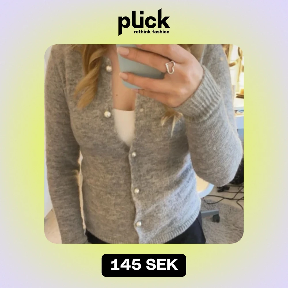 En superfin grå stickad kofta med vita pärlknappar. Fint skick och är strechig i materialet.