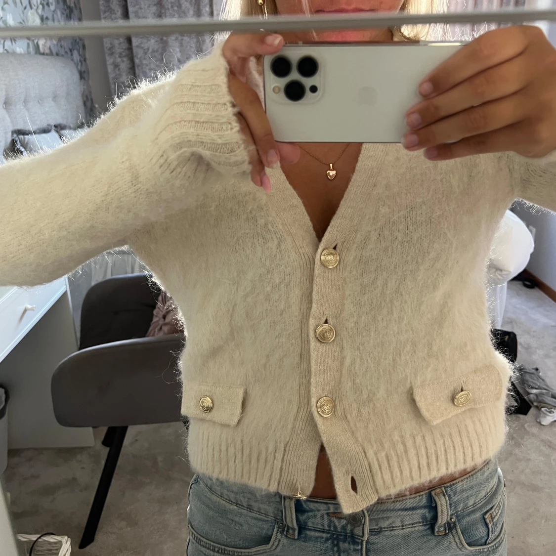 Supermjuk och fluffig krämvit kofta från Marella med snygga guldknappar och två små fickor framtill. Helt oanvänd. Nypris 2399kr😇