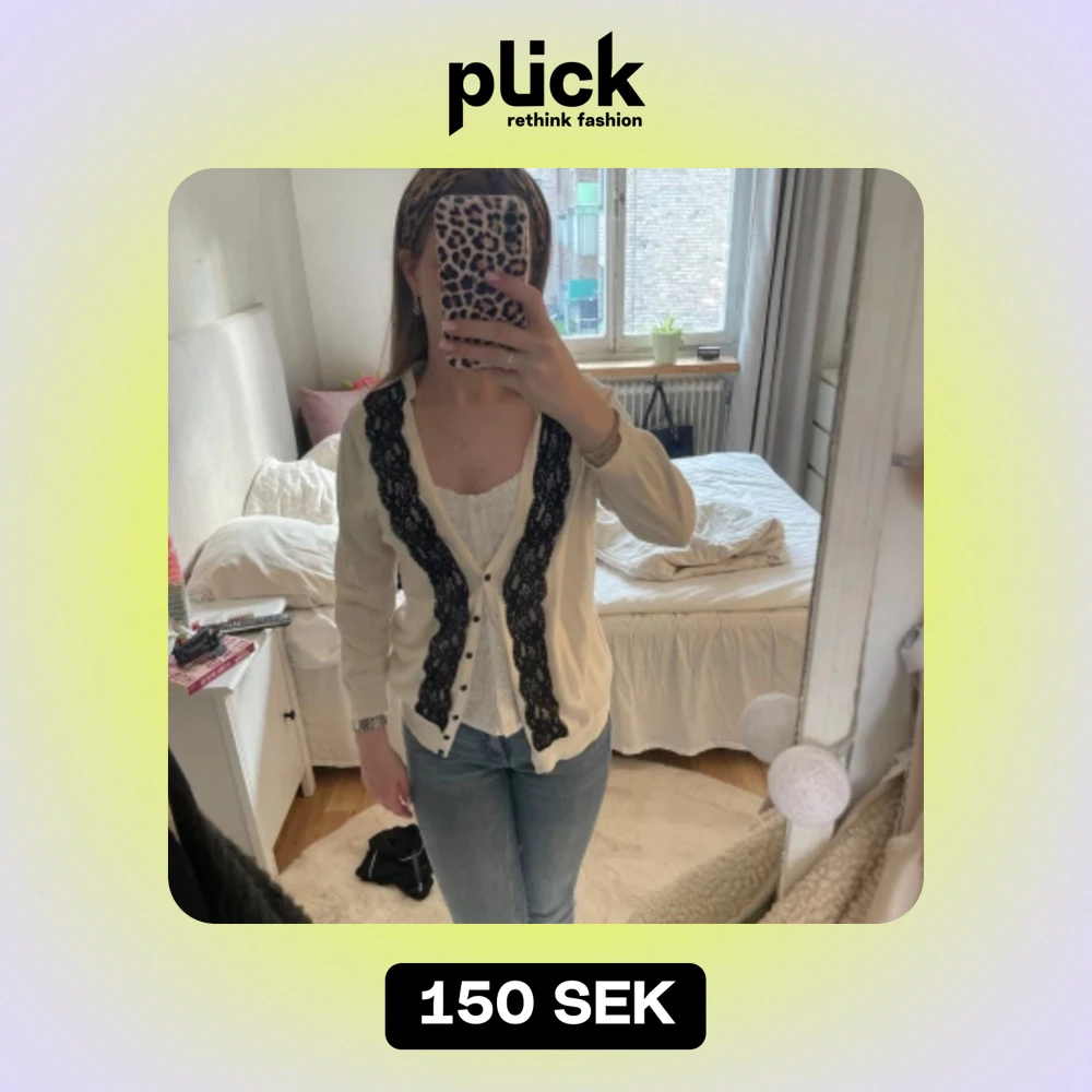 Säljer min tre kvarts ärmad kofta ifrån hm som är i jätte fin benvit färg med svart spets och knappt andvänd