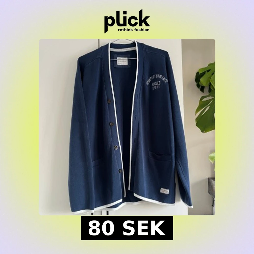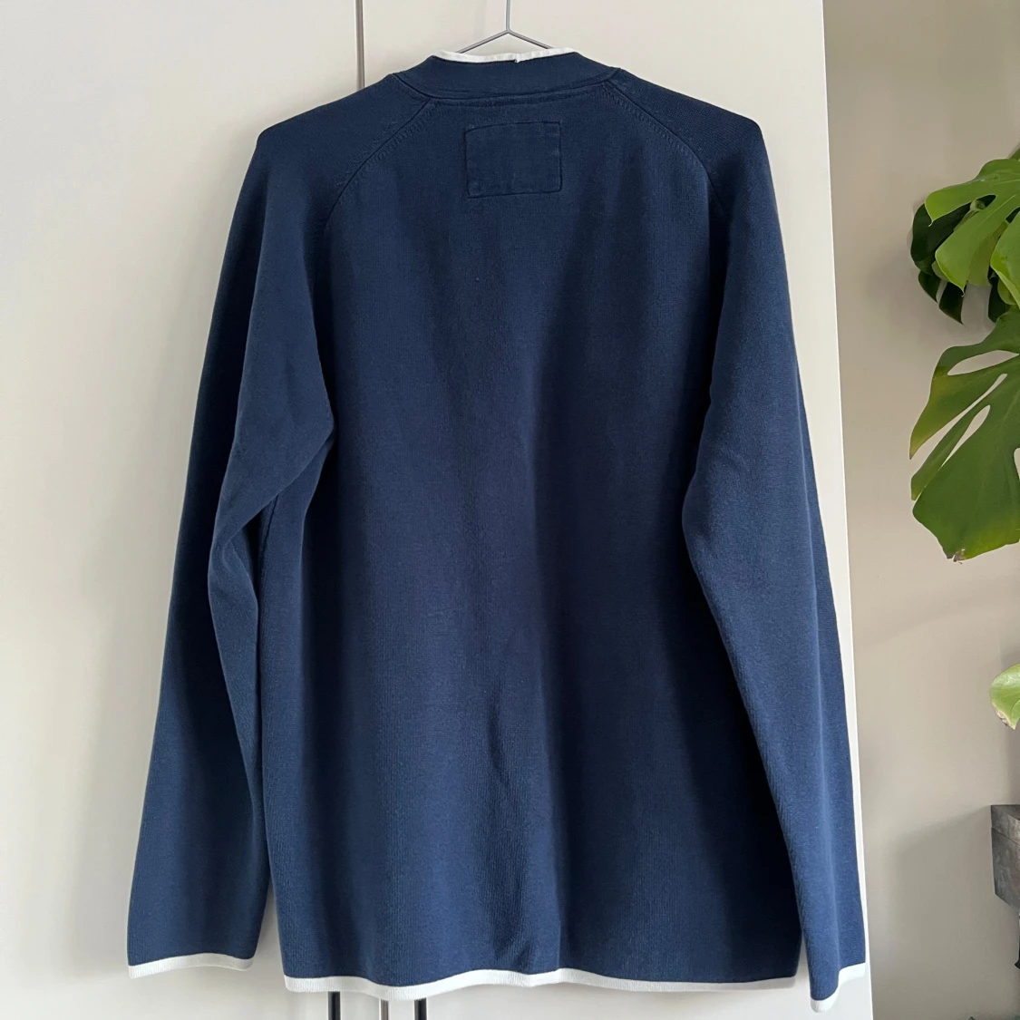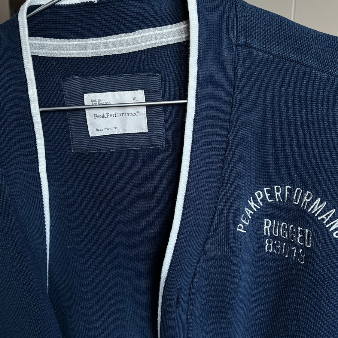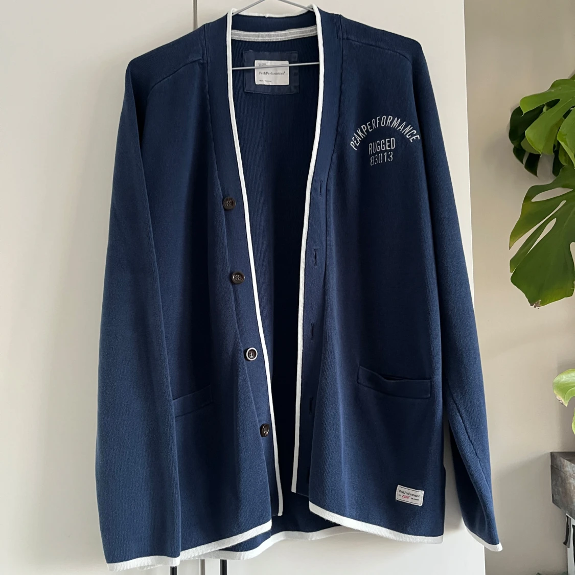 En snygg mörkblå herrkofta från Peak Performance med vit kant och broderad logga på bröstet. Koftan har knappar framtill och långa ärmar. Perfekt för en stilren look. Har använts som oversized kofta. Lite urtvättad vilket syns på bilden, annars är den i fint skick och hel.