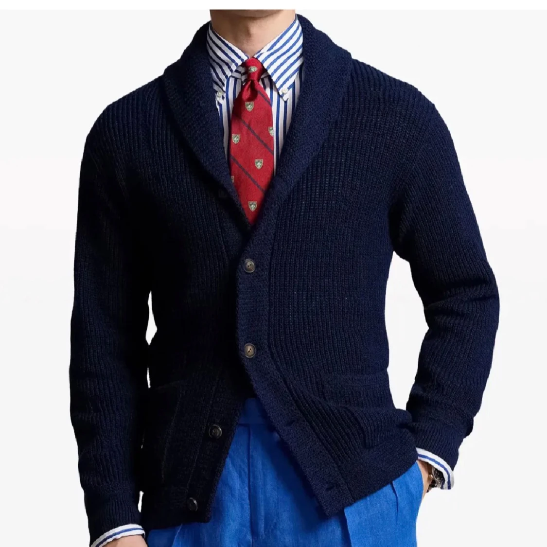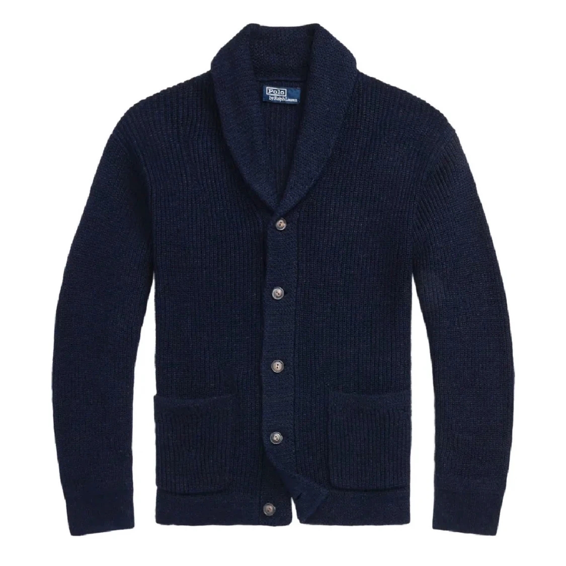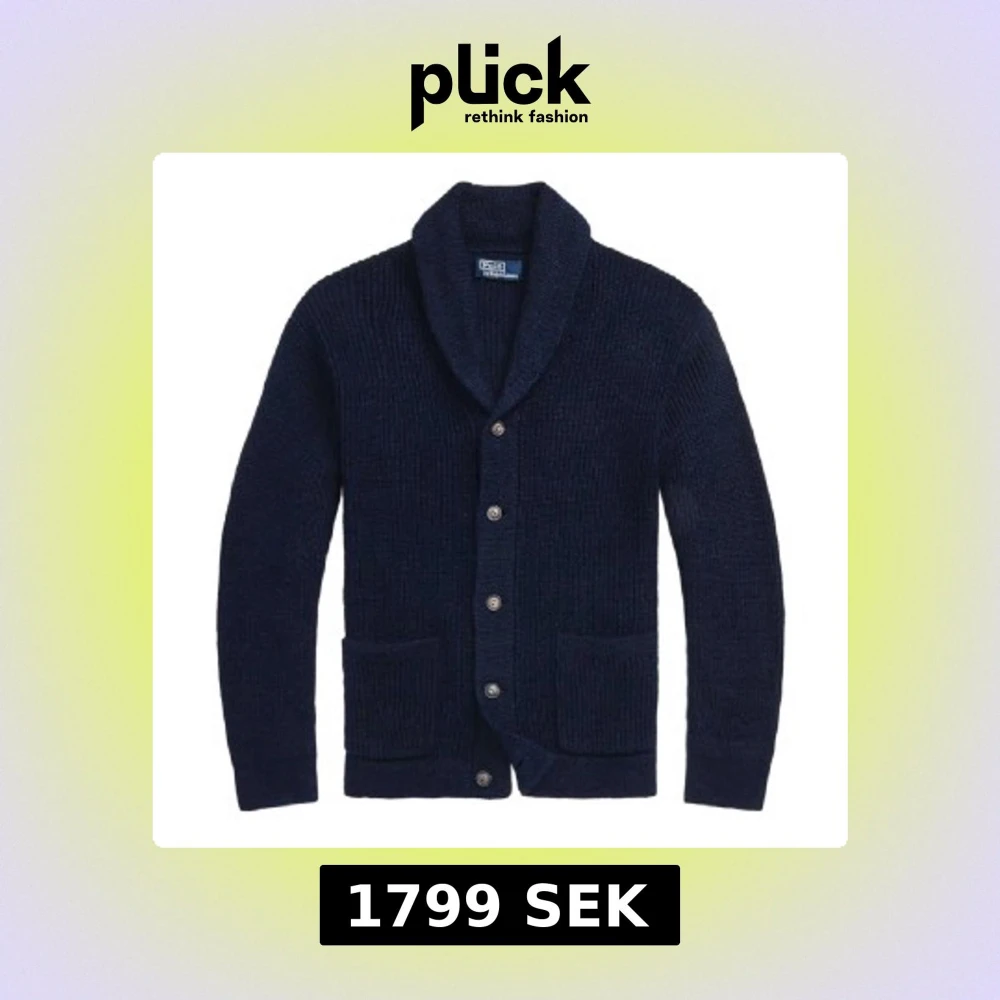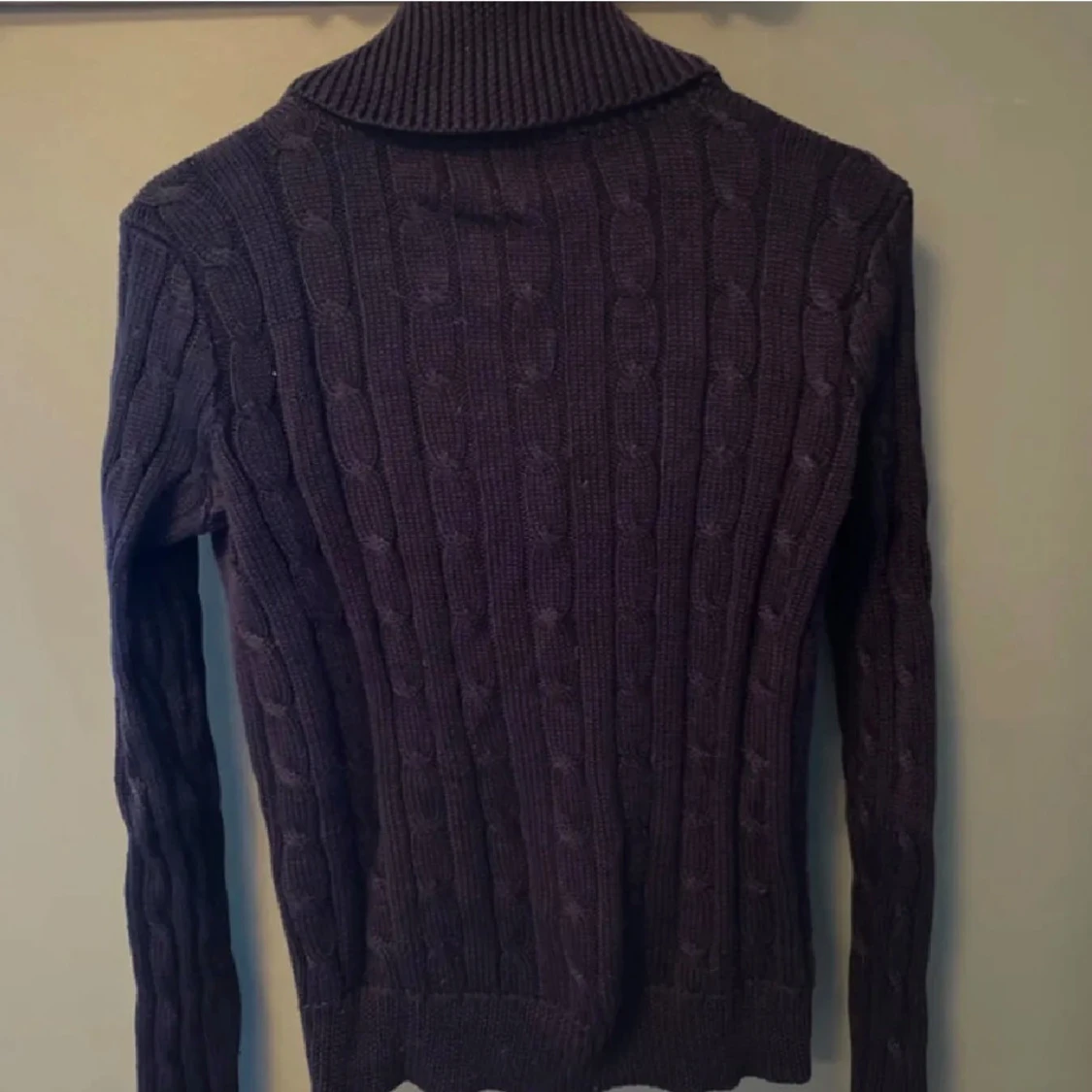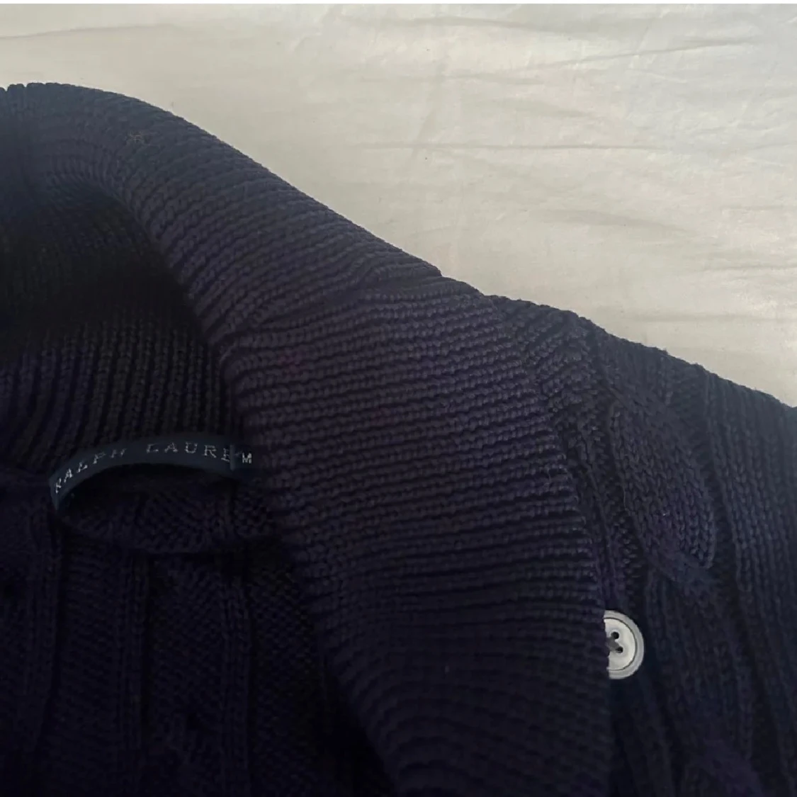 Snygg mörkblå kofta från Polo Ralph Lauren med grovstickad struktur och kabelstickat mönster. Koftan är liten i storlek och har skada på ena knappen (bild 5)