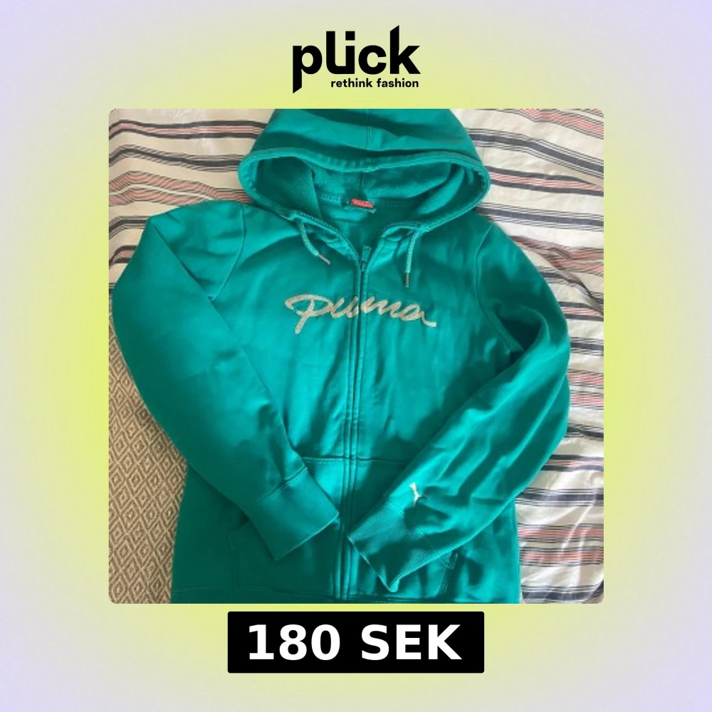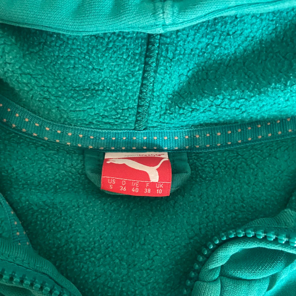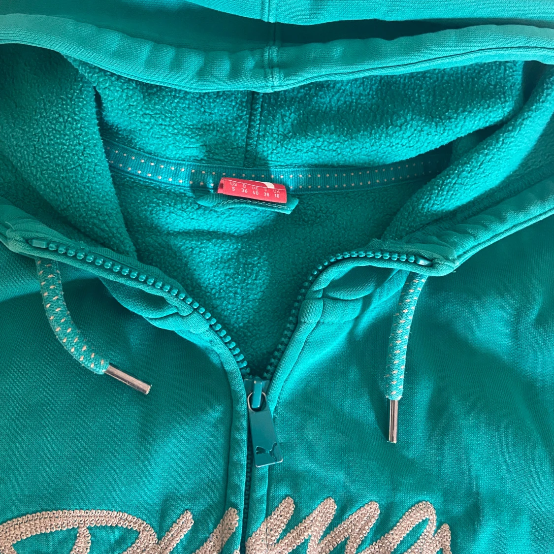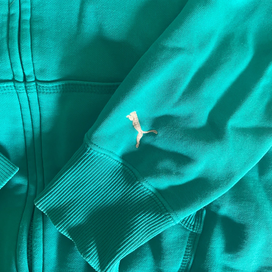 Turkos hoodie från Puma med broderad logga i silver på bröstet och liten Puma-symbol på ärmen. Tröjan har huva med snörning, mjukt fleecefoder och praktisk dragkedja framtill. Perfekt för chill dagar eller när du vill ha något bekvämt och snyggt.