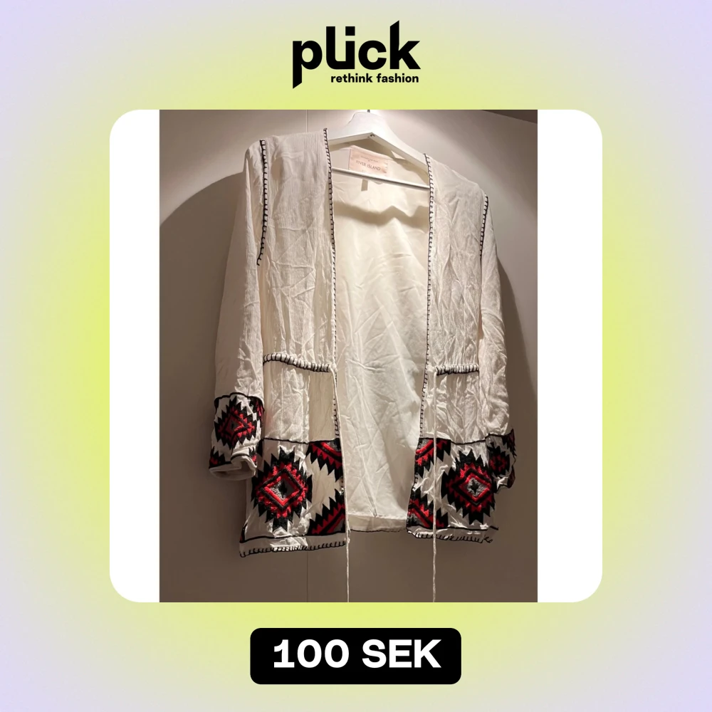 Säljer en superfin vit kimono från River Island med snyggt broderat mönster i svart och rött. Den har långa ärmar och knytband framtill. Säljs pga för liten tyvärr