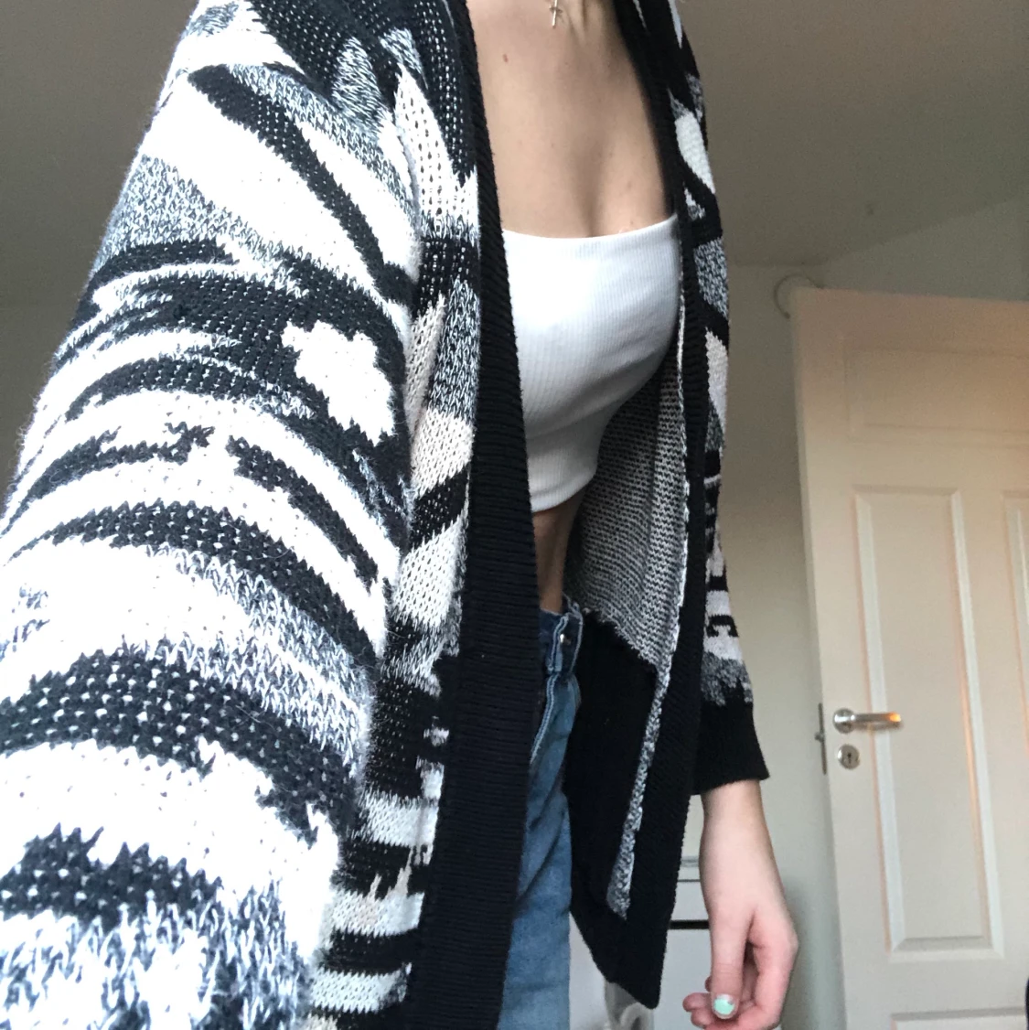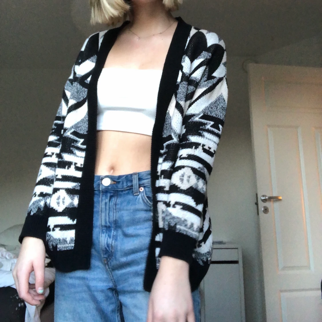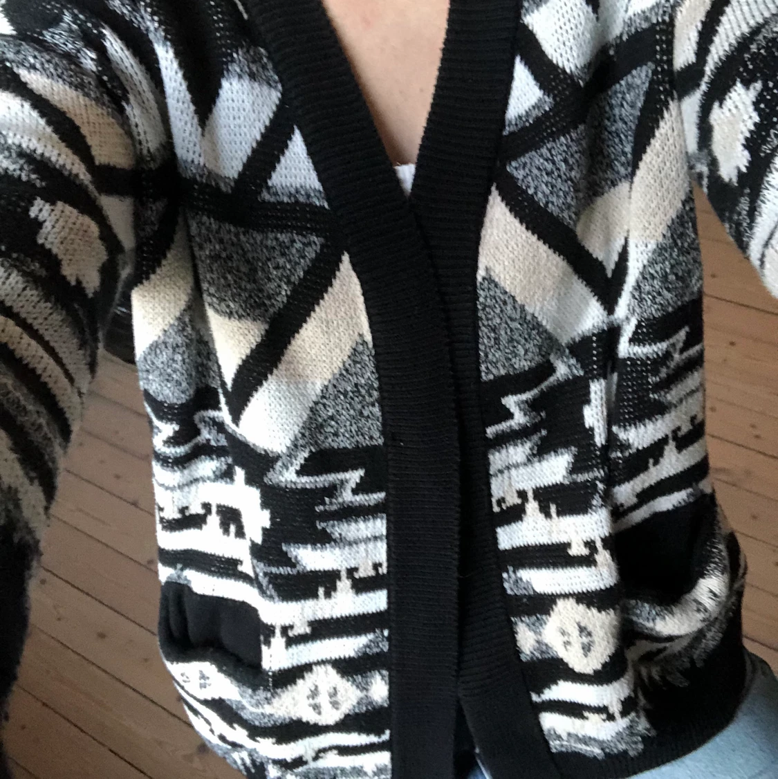 En jĂ€ttegullig stickad kofta, i massa mönster, fĂ€rgerna svart, vit och grĂ„! Köpt pĂ„ second hand!â€ïž stor i storleken!