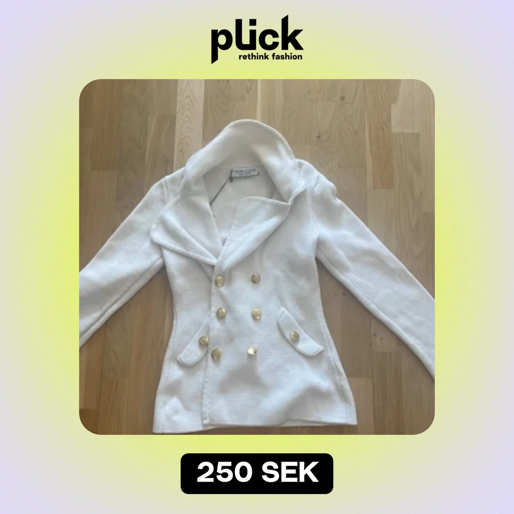 Jätte fin vit kofta med guld detaljer! Om man önskar så kan man byta ut knapprna men de följs inte med andra knappar om du köper den! Inga fläckar aldrig använt stolek xs passar S tight i midjan passar till hösten o sommar kvällar Skriv vid intresse