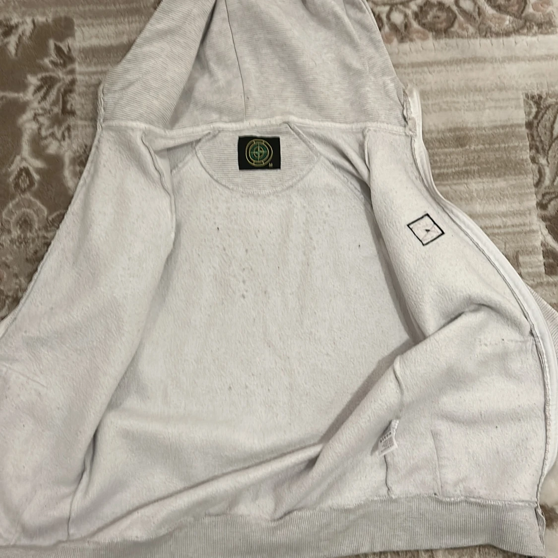 Säljer en snygg grå hoodie från Stone Island. Den är i storlek M men passsr både S för jag har storlek S i koftor o den passar mig bra och den är ganska skön och sitter bra på än pris kan diskuteras