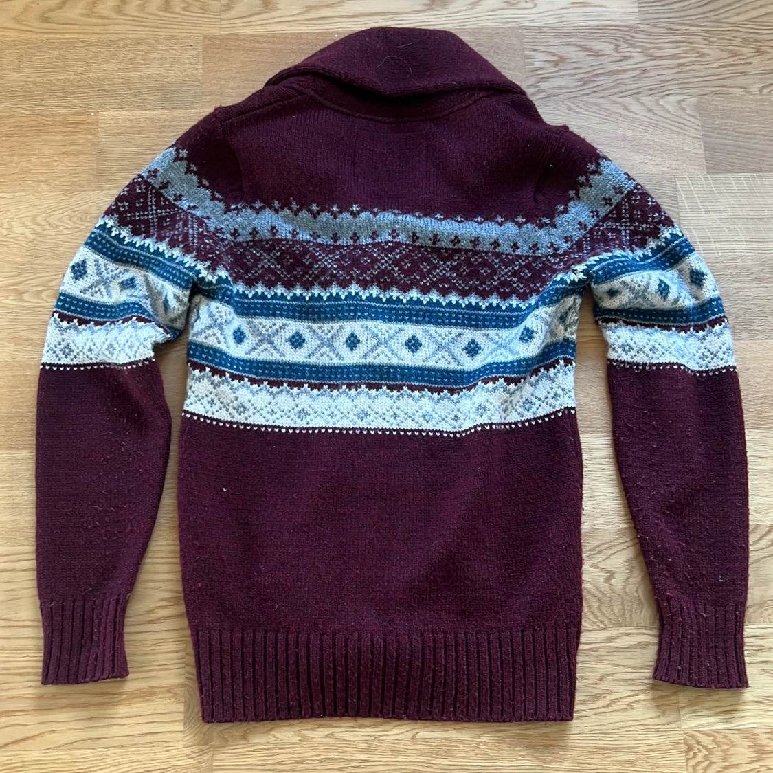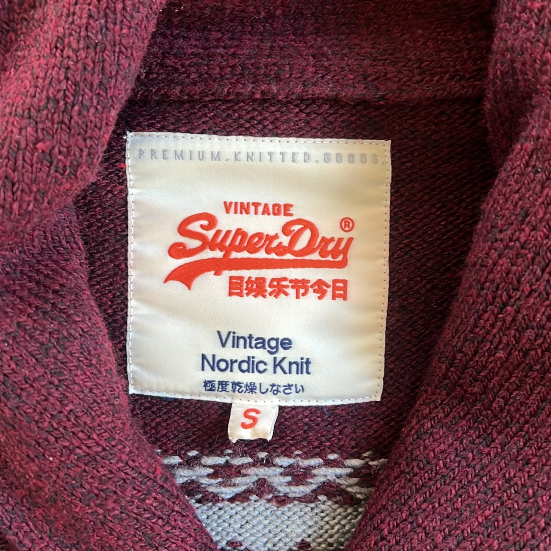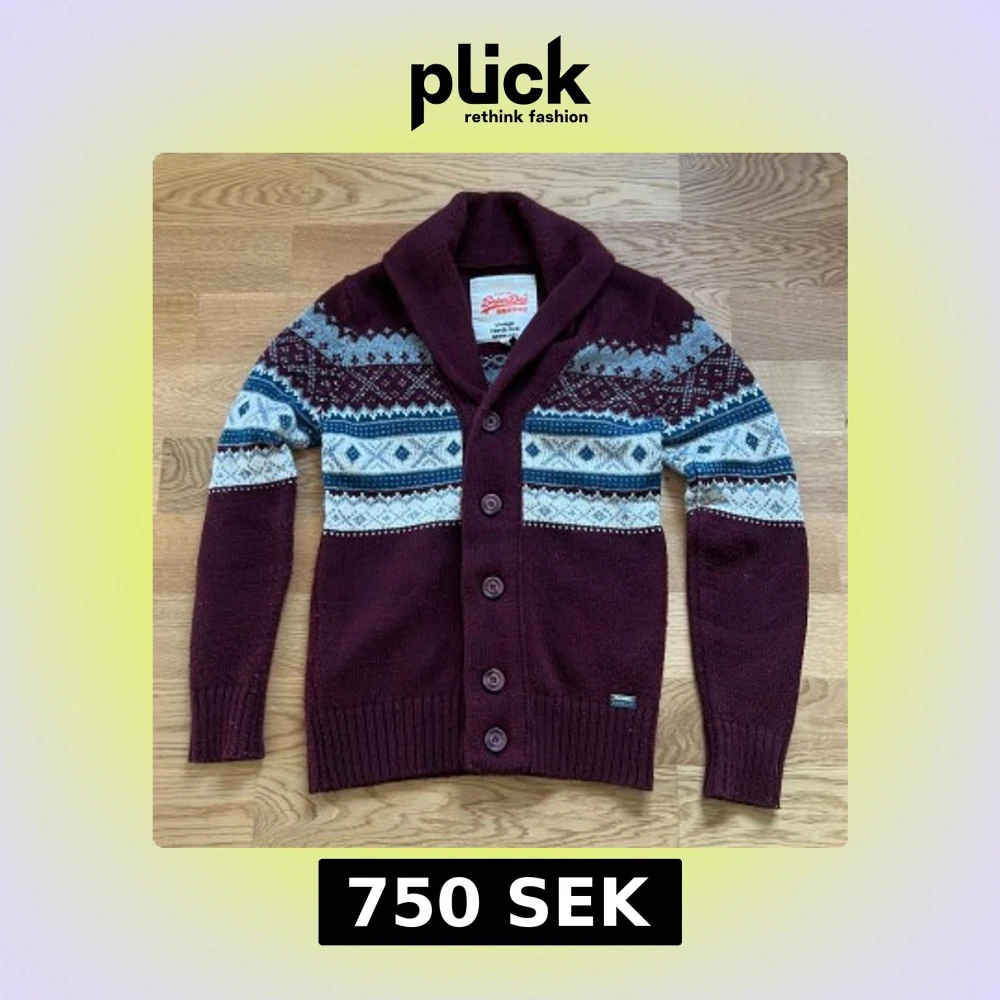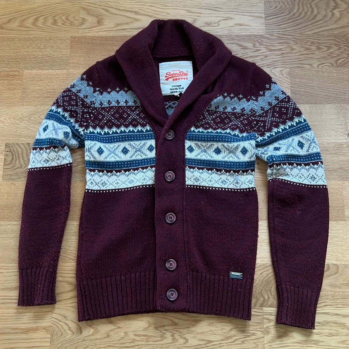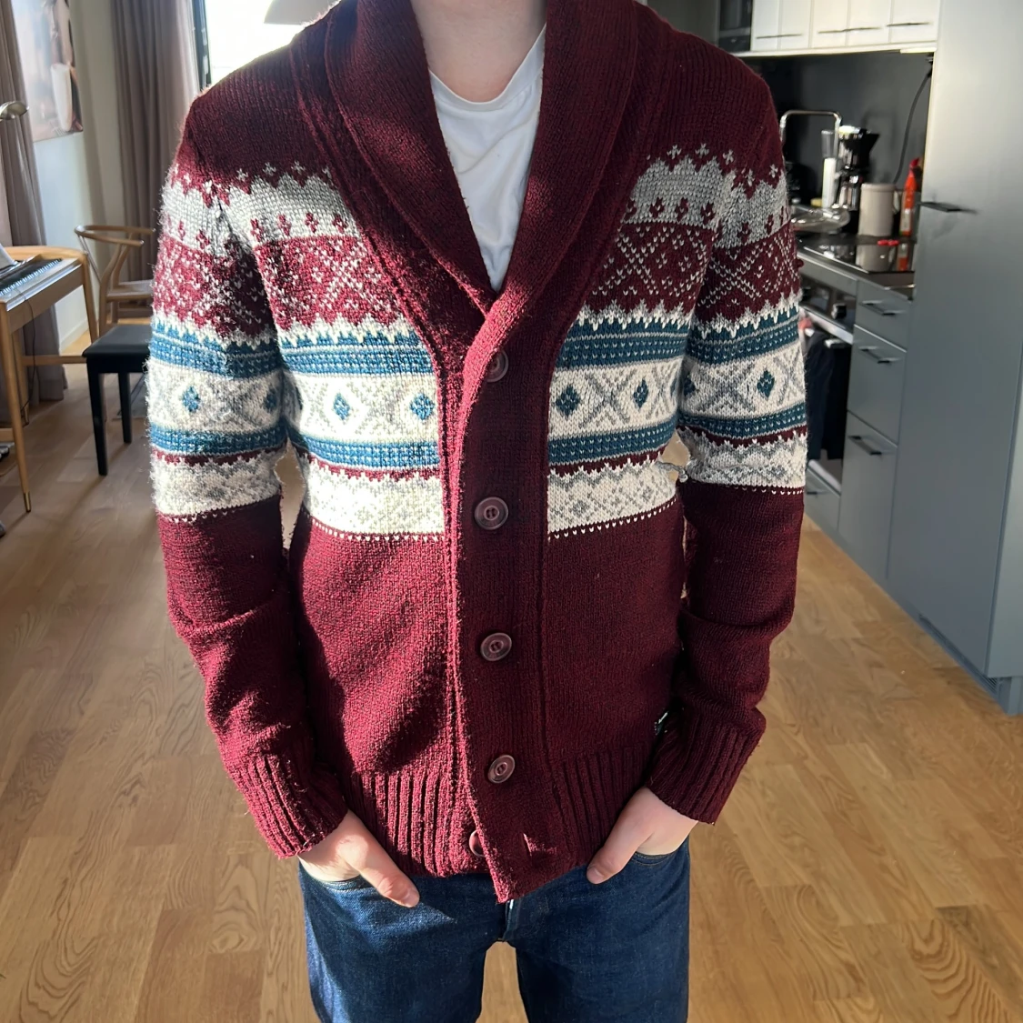Säljer en sjukt snygg mörkröd kofta från Superdry med nordiskt mönster i vitt, blått och grått. Koftan har stora knappar, bred krage och är stickad i mjukt material. Perfekt för kalla dagar och ger en chill vibe till din outfit. Modellen är 176 och den passar bra på han.