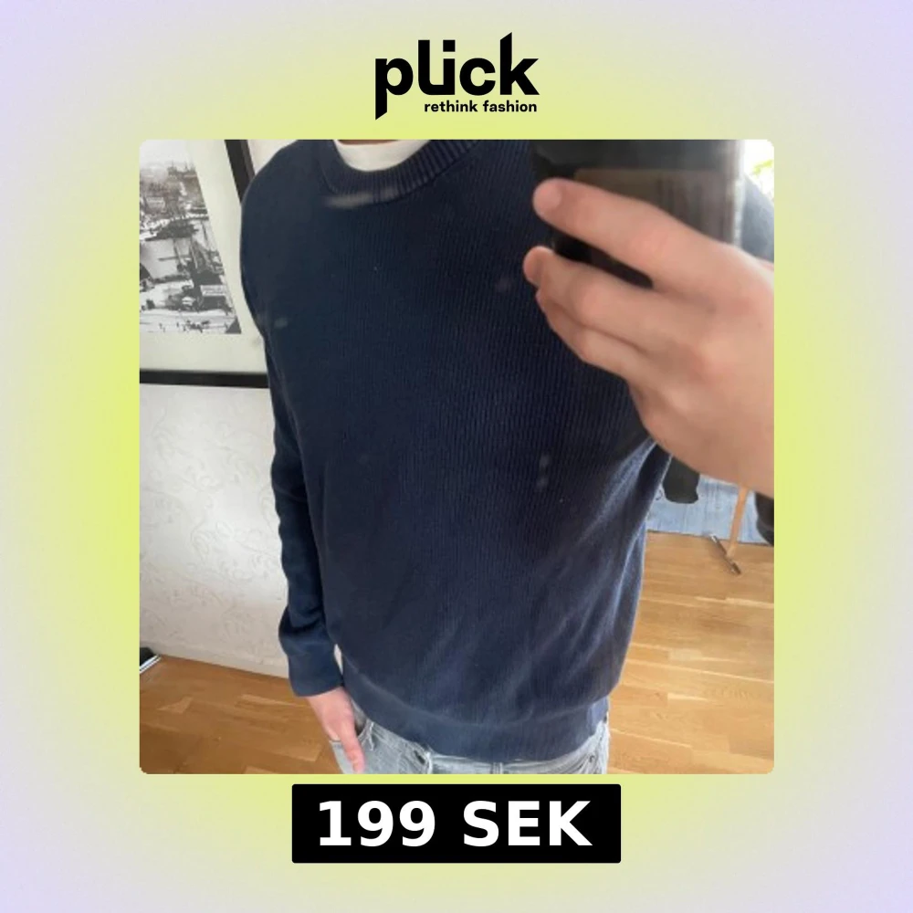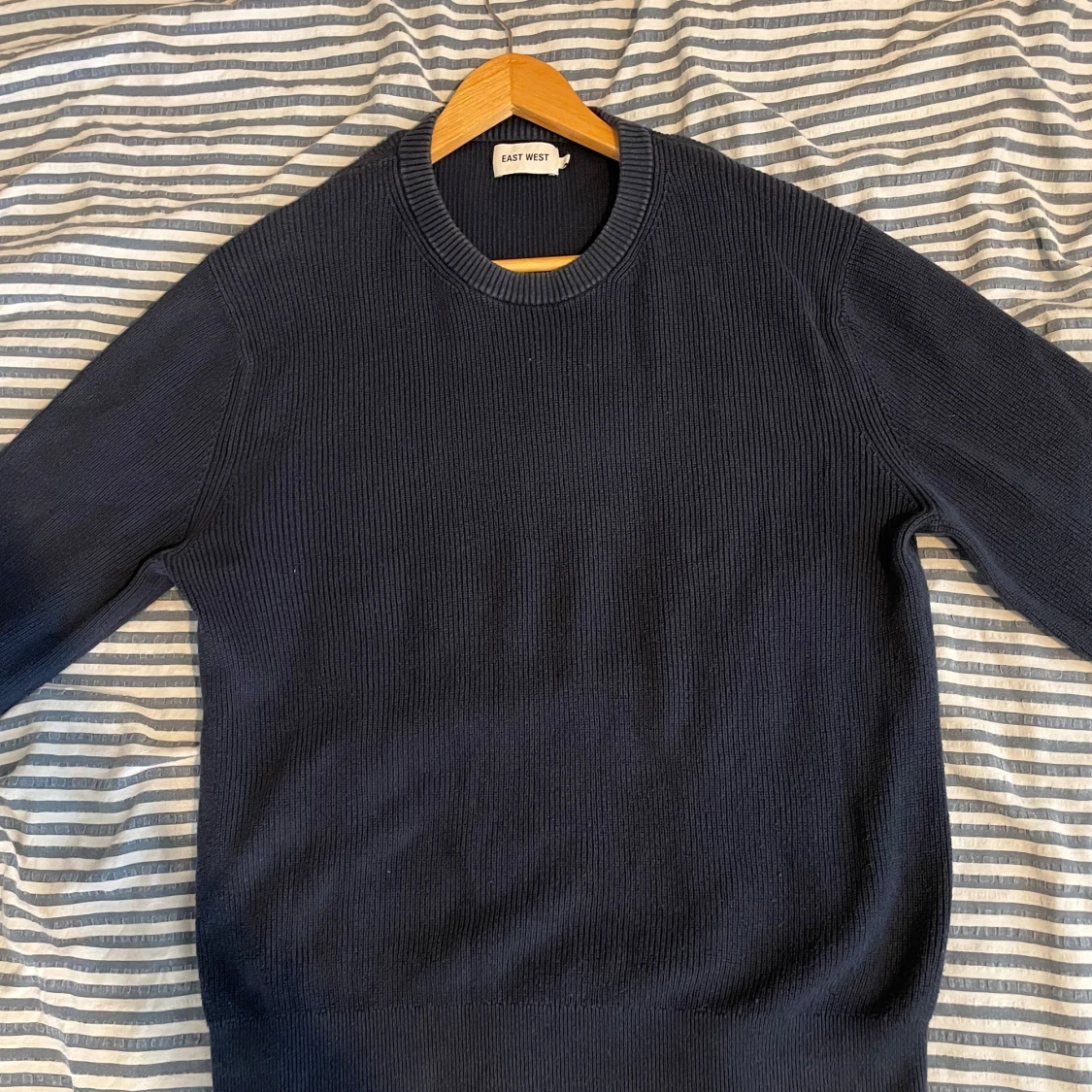 Säljer en mörkblå stickad tröja från East West i storlek L, men den sitter lätt som storlek M. Fortfarande i bra skick, enkel och stilren design som passar till det mesta.