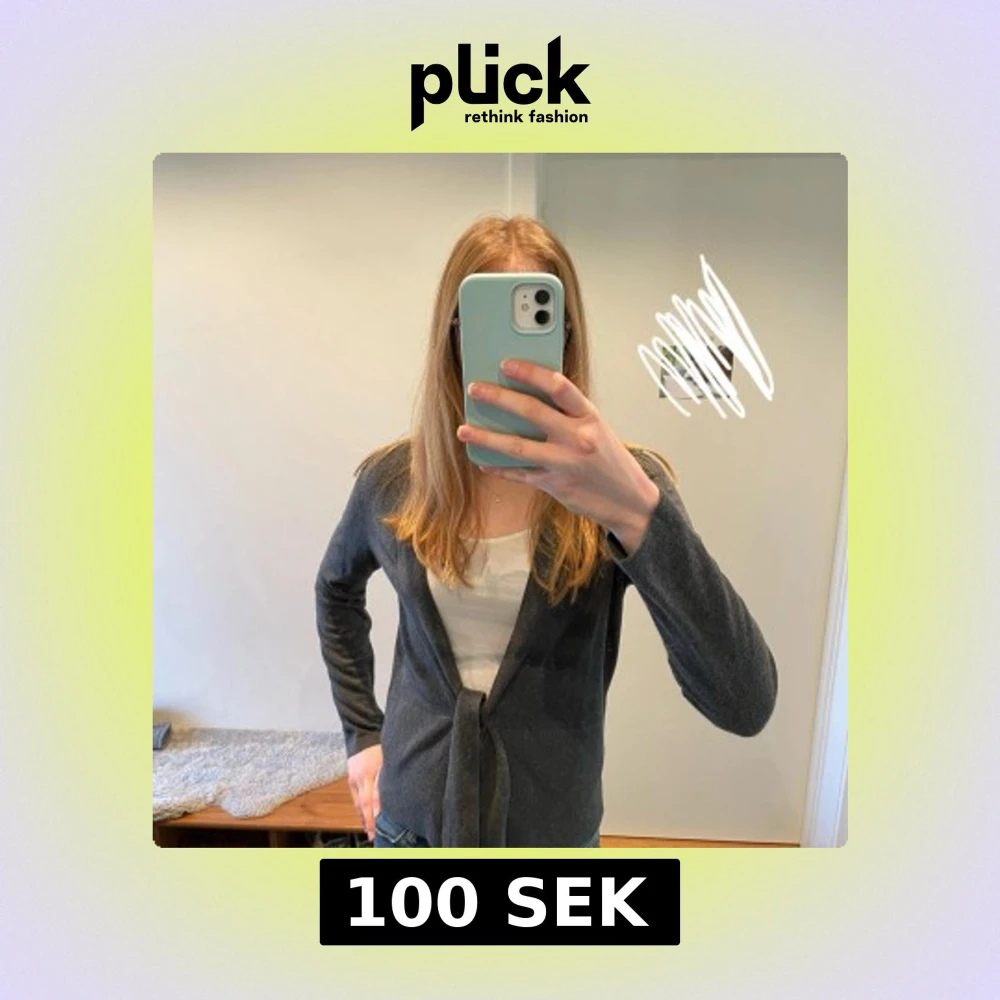 En jättefin mörkgrå kofta med knytdetalj. Passar bra nu till våren men också till lite svalare sommarkvällar. Tyget är töjbart och troligen av bomull, det finns ingen storlek i plagget men den sitter utmärkt för mig som har storlek S och den skulle nog passa bra för någon med storlek M också, då passformen går att justera med knytbandet.