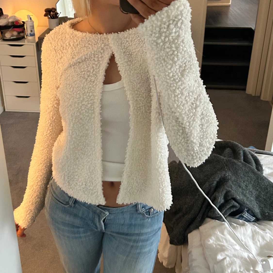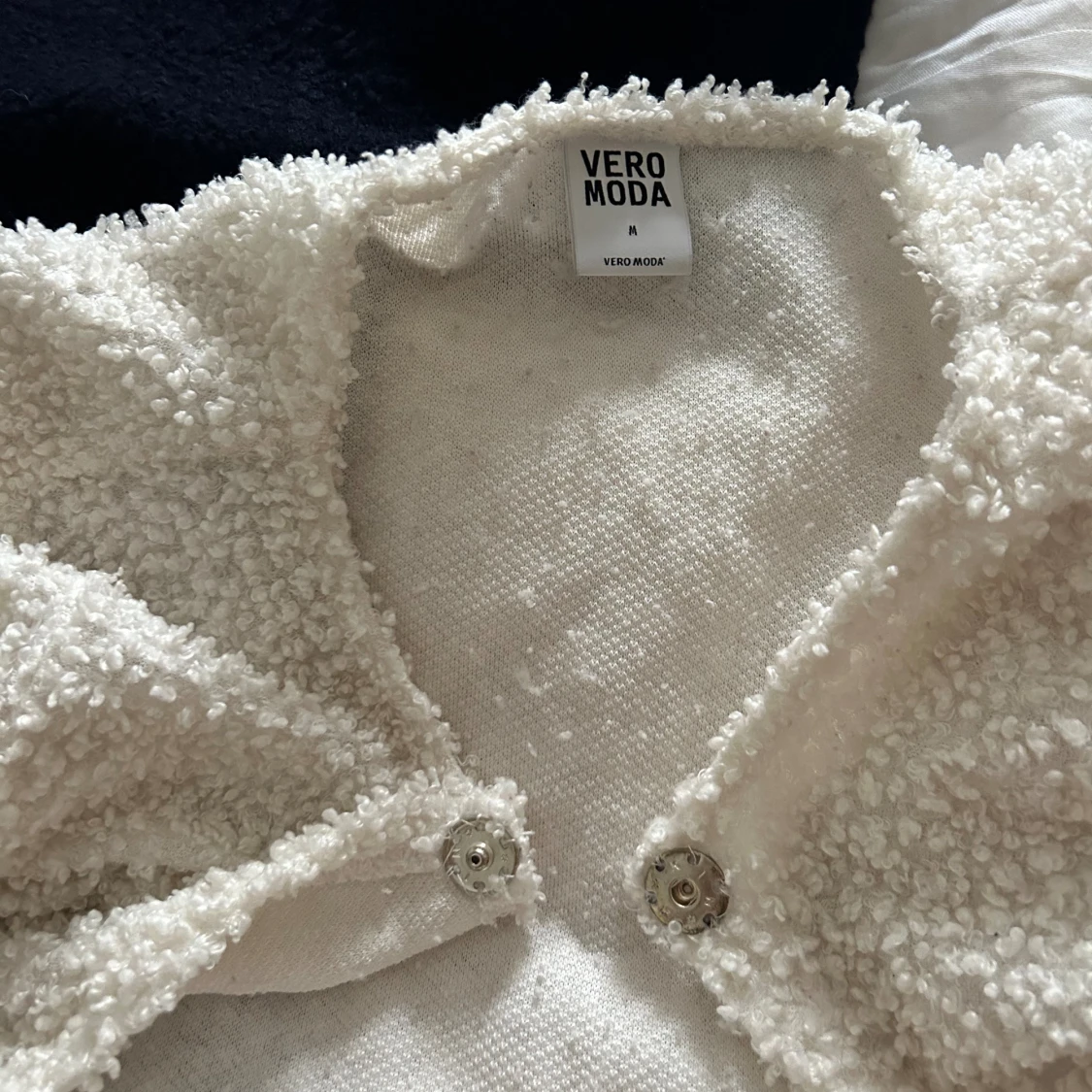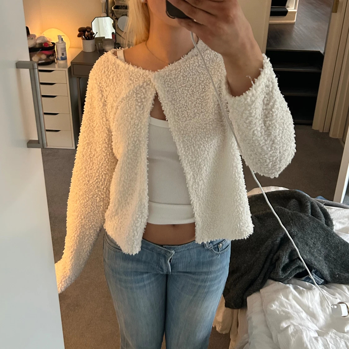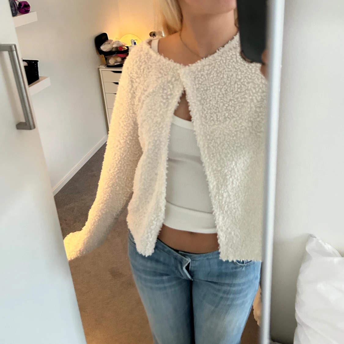 Säljer nu denna vita kofta jag köpte second hand för ett tag sedan. Koftans innersida är lite knottrig, vilket är lätt att få bort. Annars inga tydliga defekter. Även sytt på en egen knapp för att kunna ha både stängt & öppet. Skriv privat för frågor