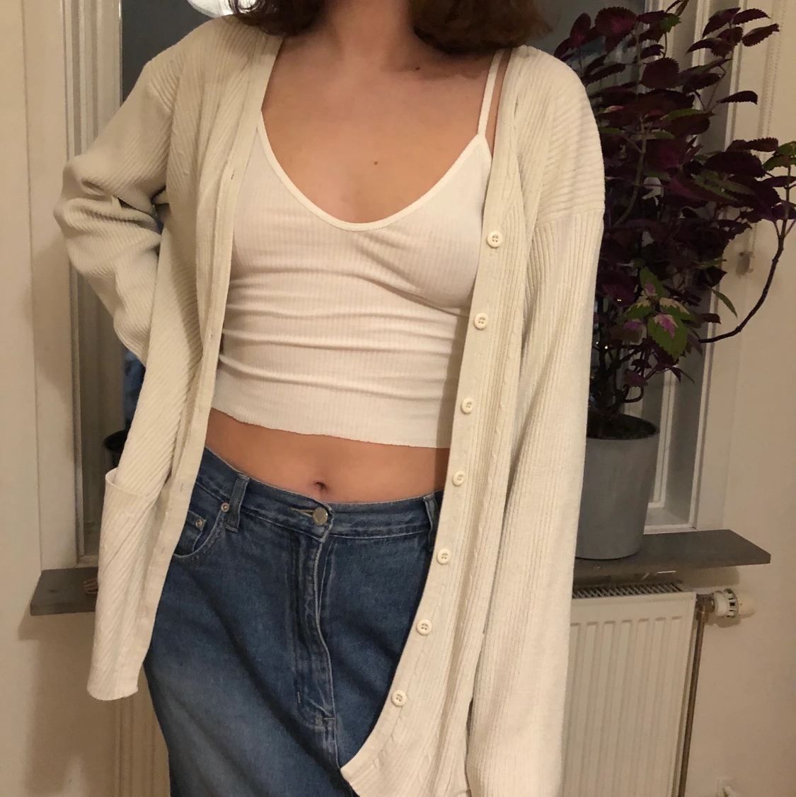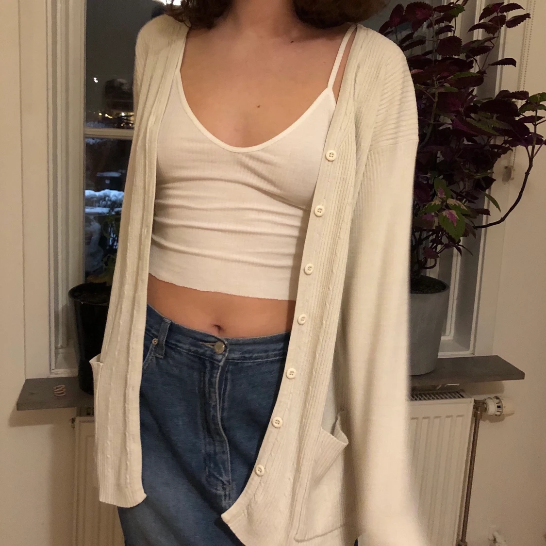 En jätteskön krämvit stickad kofta! Passar till allt, köpt på secondhand, lite längre i modellen🙏🏻 hör av er vid intresse! Modellen är s-m som referens