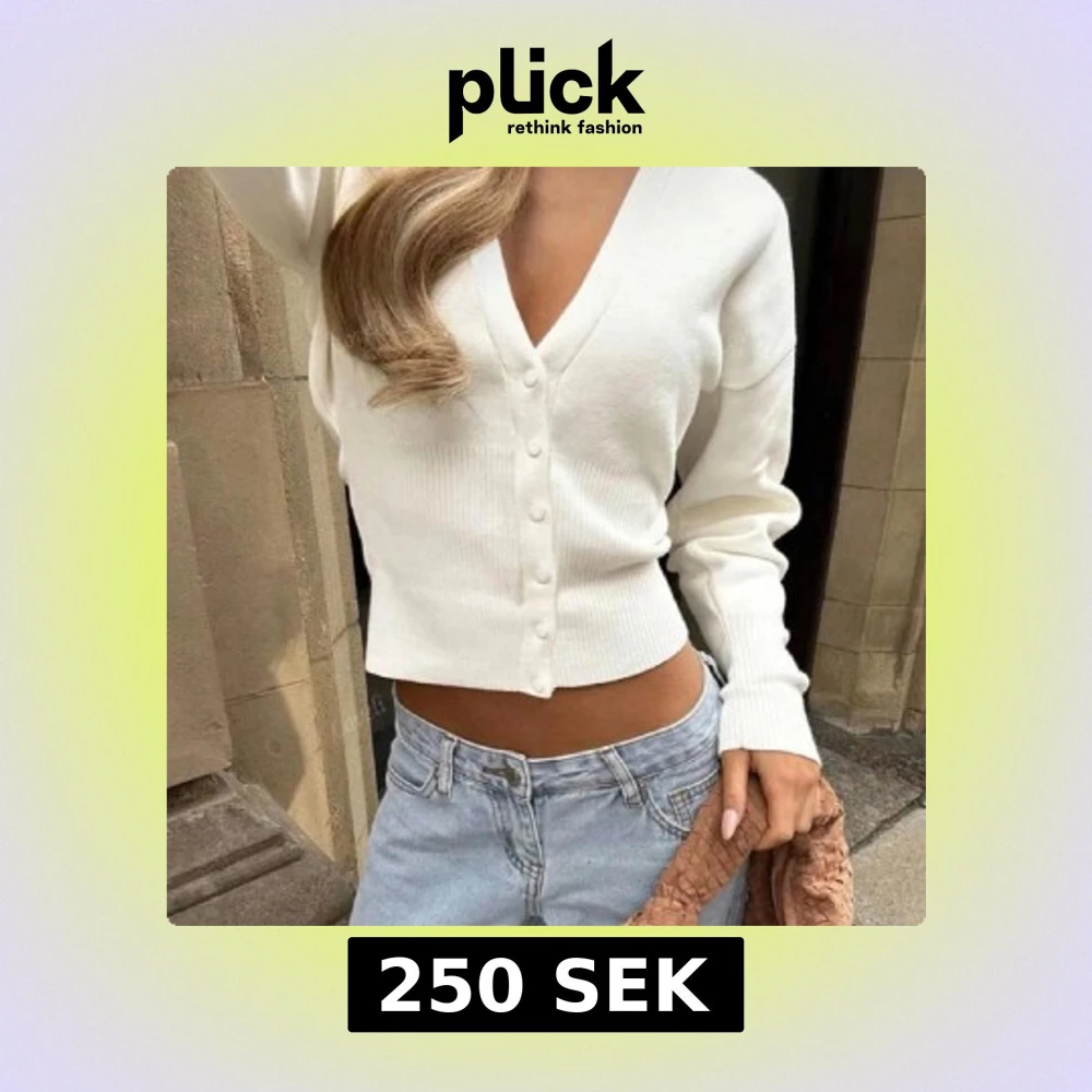 Snygg vit croppad kofta med v-ringning och ribbade detaljer. Tröjan har långa ärmar och stängs med knappar framtill. Perfekt att styla med jeans för en trendig look.
