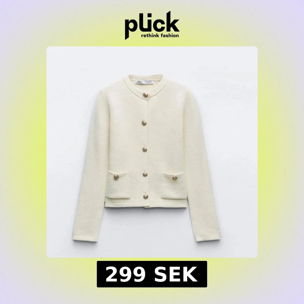 Snygg beige kofta från Zara med guldknappar och rund halsringning. Den har en croppad passform och långa ärmar. Perfekt för att ge en stilren look till din outfit. Stickat material. Knappt använd samt svår att få tag i (slutsåld) därav priset, det kan dock diskuteras (Nypris 499kr). Strl Xs/S 💕