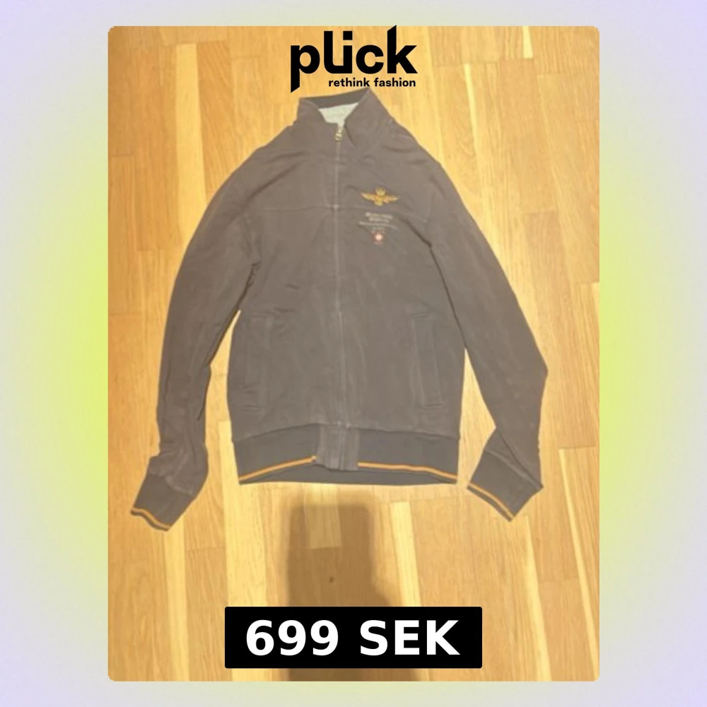 Säljer en mörkblå ziptröja från Aeronautica Militare med broderad logga och text på bröstet. Tröjan har ribbade muddar med orange detalj, hög krage och dragkedja framtill. Perfekt för dig som gillar sportig och stilren look.