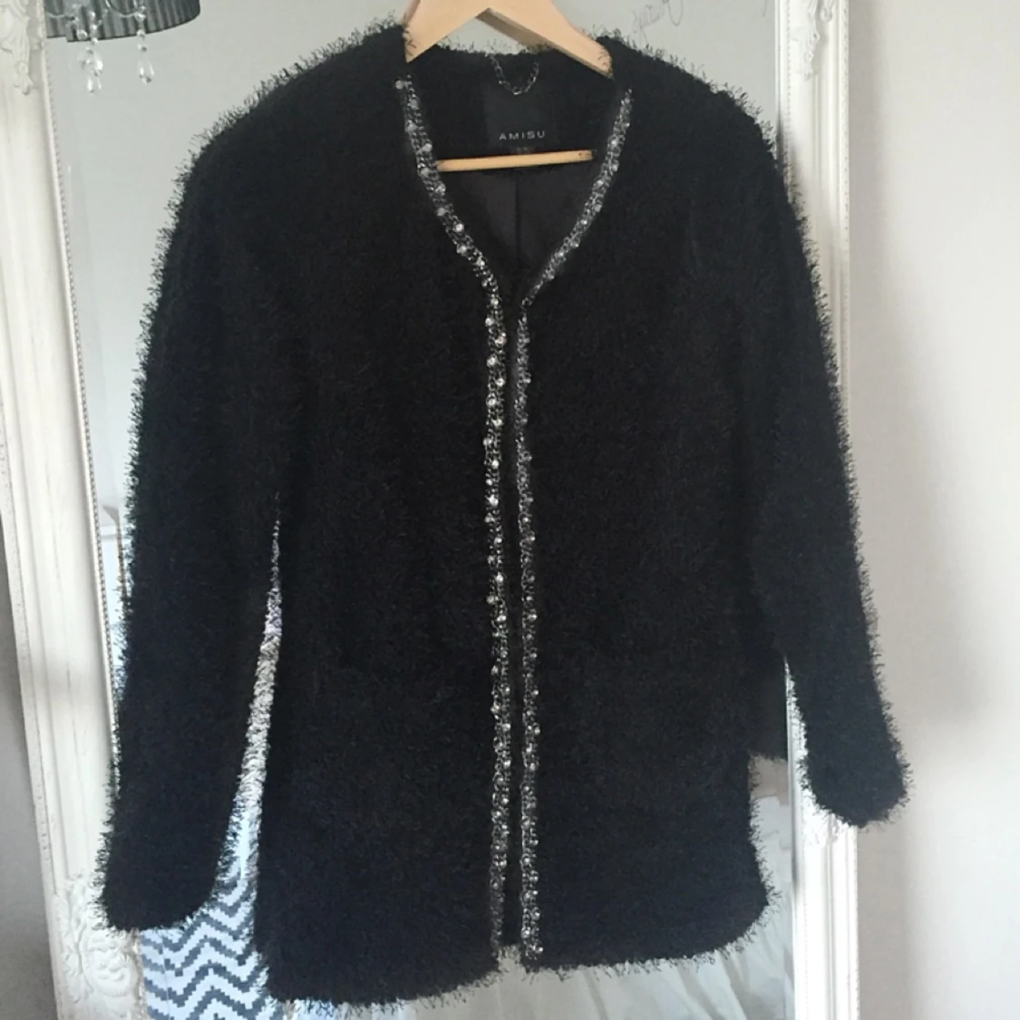 Svart fluffig/lurvig kofta med fina detaljer av stenar på framsidan längs kanten. Sluts med hyskor framtill. Två rymliga fickor framtill. Mycket bra skick!