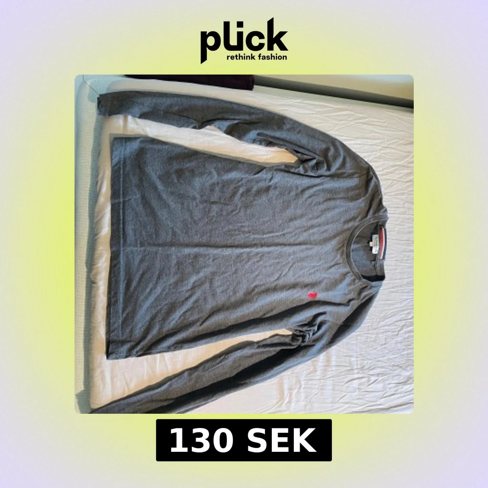 Säljer en stilren grå långärmad tröja från U.S. Polo Assn med en liten röd logga broderad på bröstet. Tröjan har rund halsringning och är perfekt för en enkel och klassisk look.