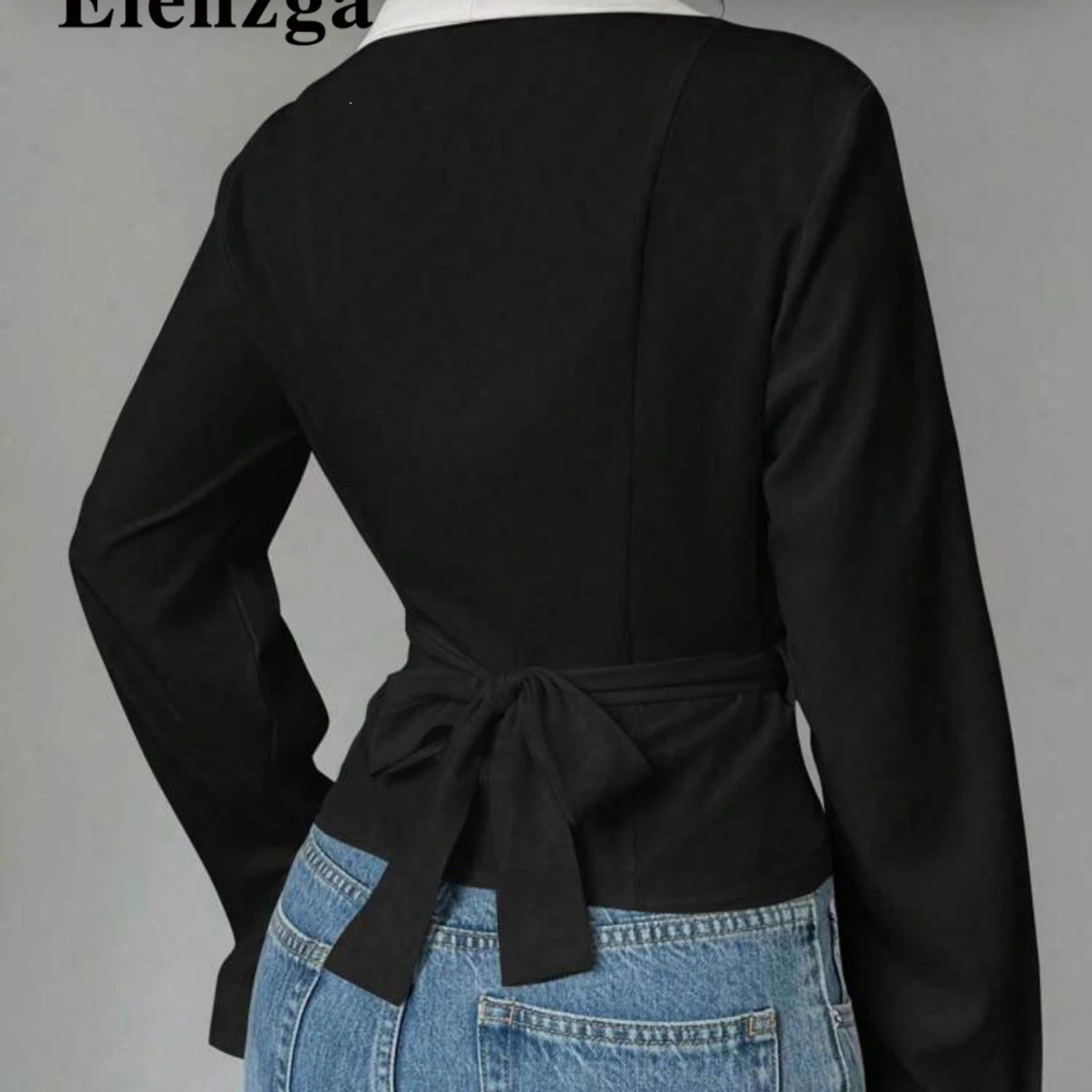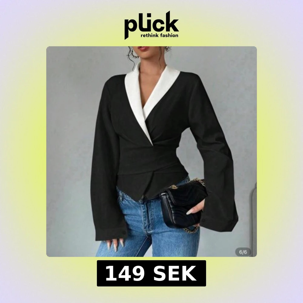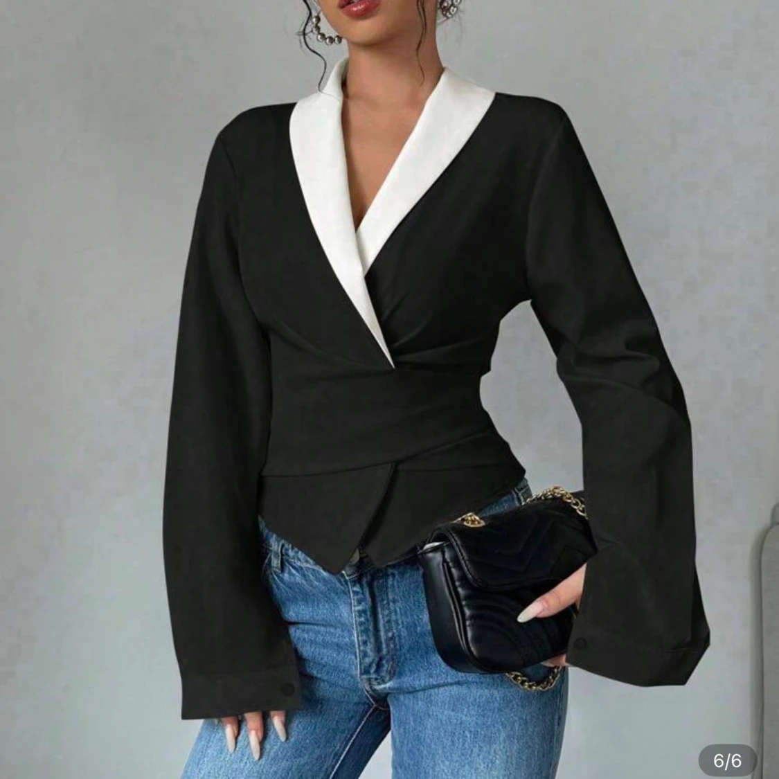 Snygg svart omlottblus från Elenizga med vit krage och långa ärmar. Blusen har en markerad midja med knytband bak och djup v-ringning framtill. Perfekt för dig som gillar stilrena och trendiga plagg med en twist. Aldrig använd