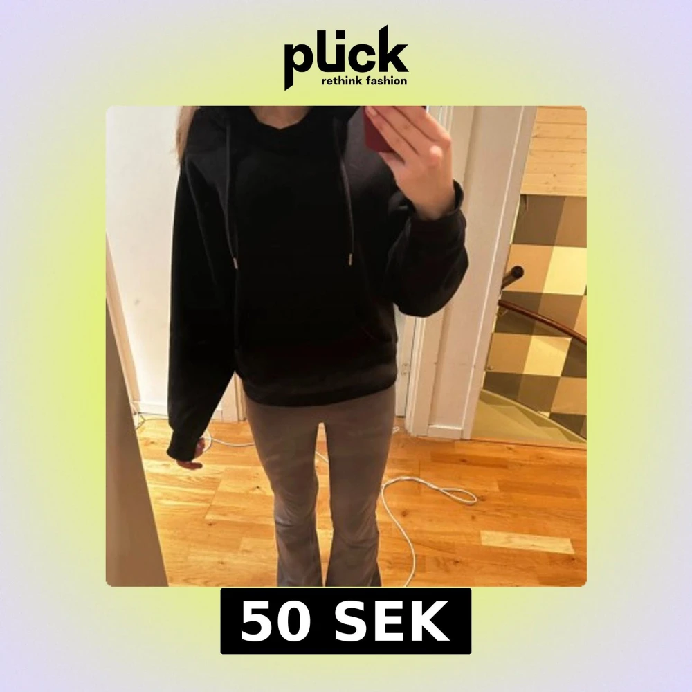 Säljer en svart hoodie med huva och dragsko. Tröjan har långa ärmar och en klassisk passform. Perfekt för en avslappnad stil och enkel att matcha med olika outfits.