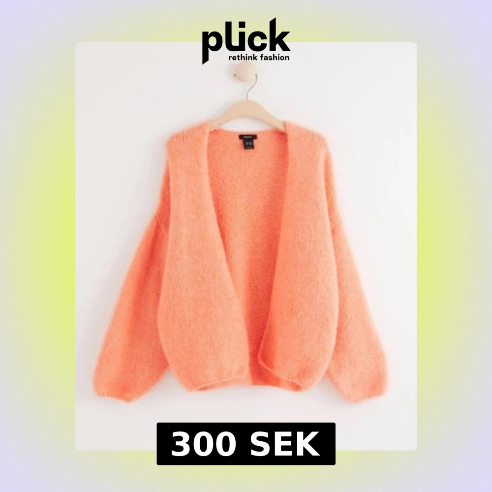 Supermysig korall färgad stickad kofta från Lindex. Koftan är öppen framtill och har en fluffig, mjuk känsla som gör den perfekt för kyliga dagar. Passar dig som gillar färg och oversized stil.