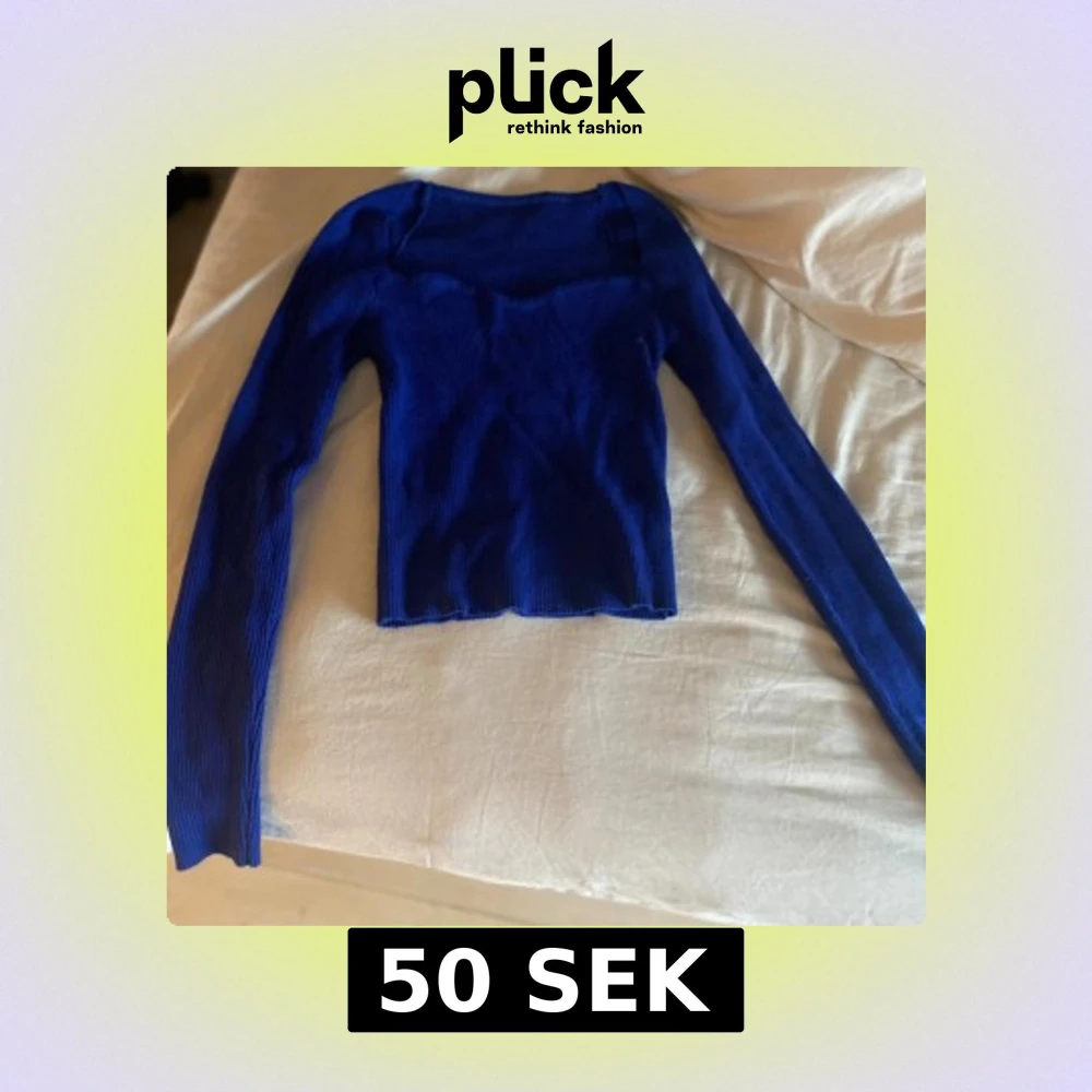 Säljer en kornblå ribbad långärmad topp med figurnära passform. Toppen har en lätt croppad längd och rundad halsringning. Perfekt att styla med jeans eller kjol för en snygg look.