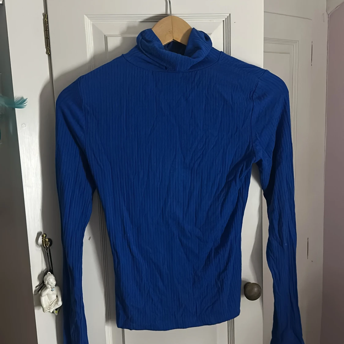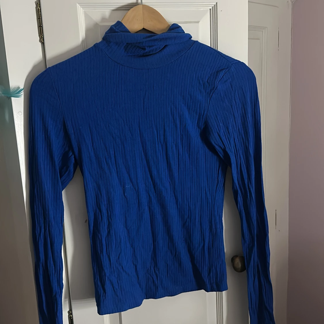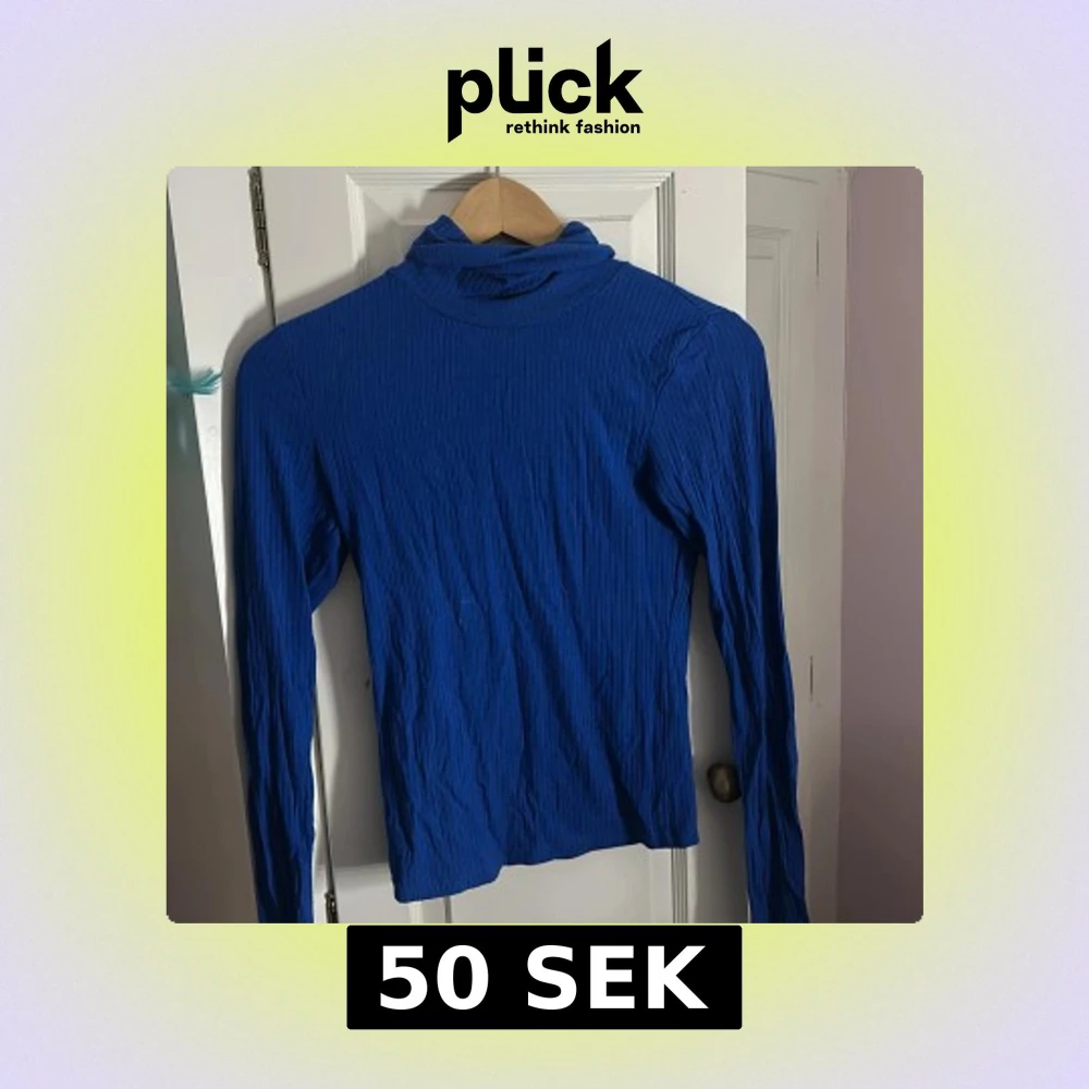 Säljer en kornblå polotröja med ribbad struktur och lång ärm. Tröjan har en tight passform och är tillverkad i ett stretchigt material som sitter snyggt på kroppen.
