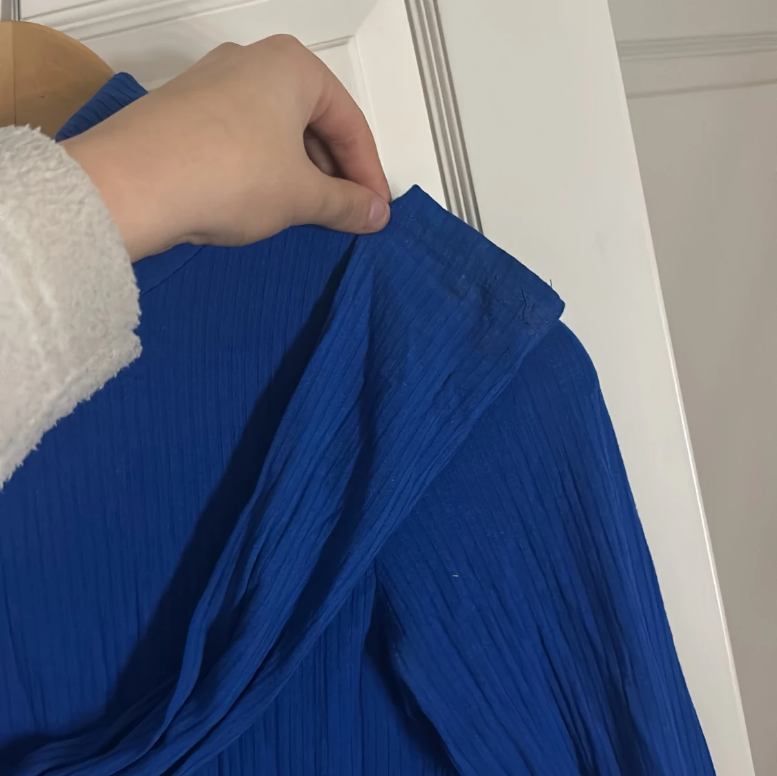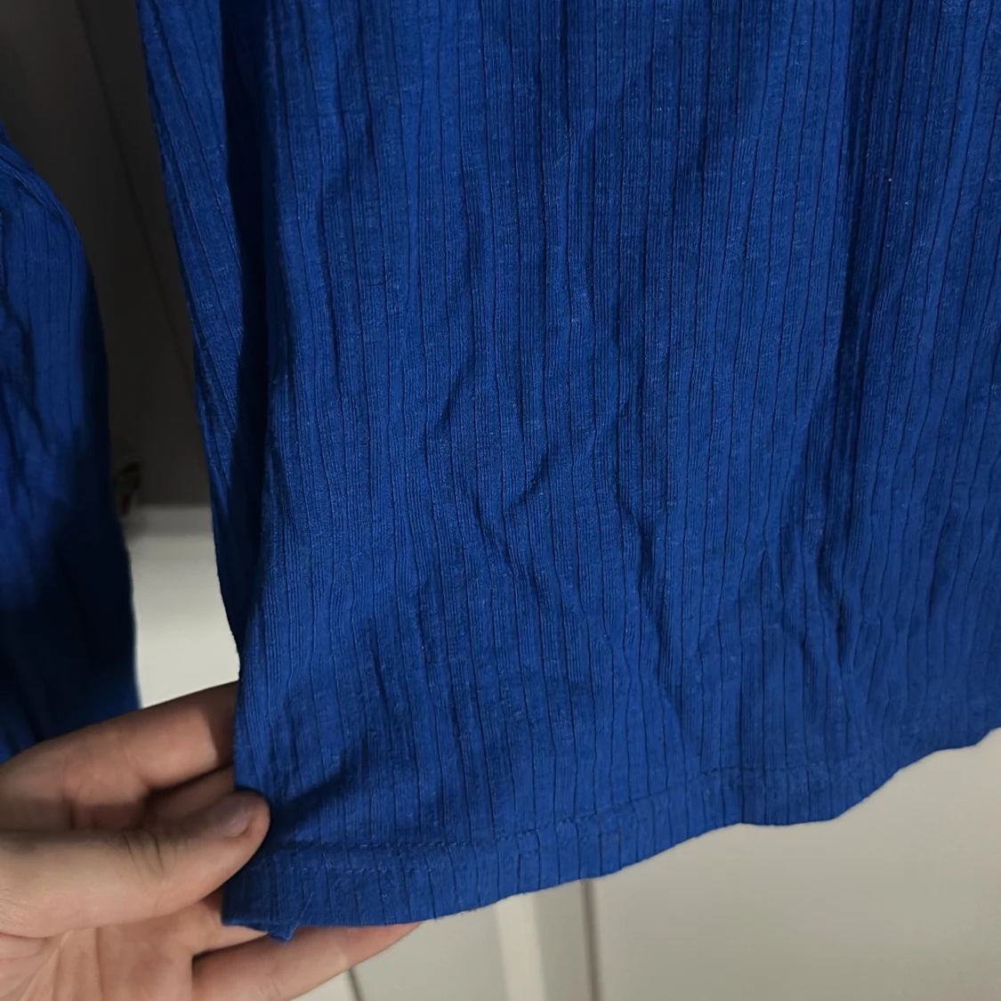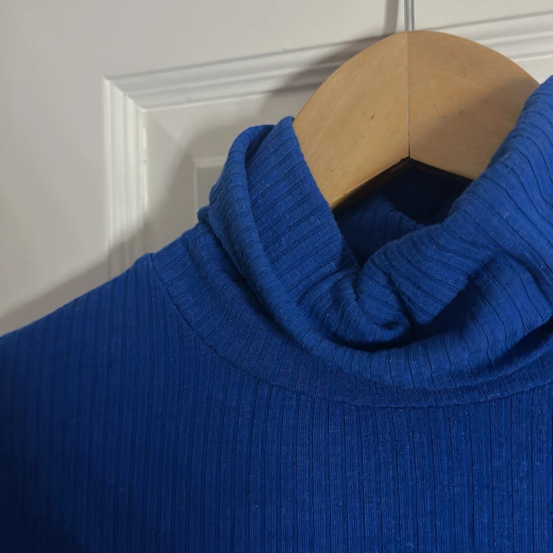 Säljer en kornblå polotröja med ribbad struktur och lång ärm. Tröjan har en tight passform och är tillverkad i ett stretchigt material som sitter snyggt på kroppen.