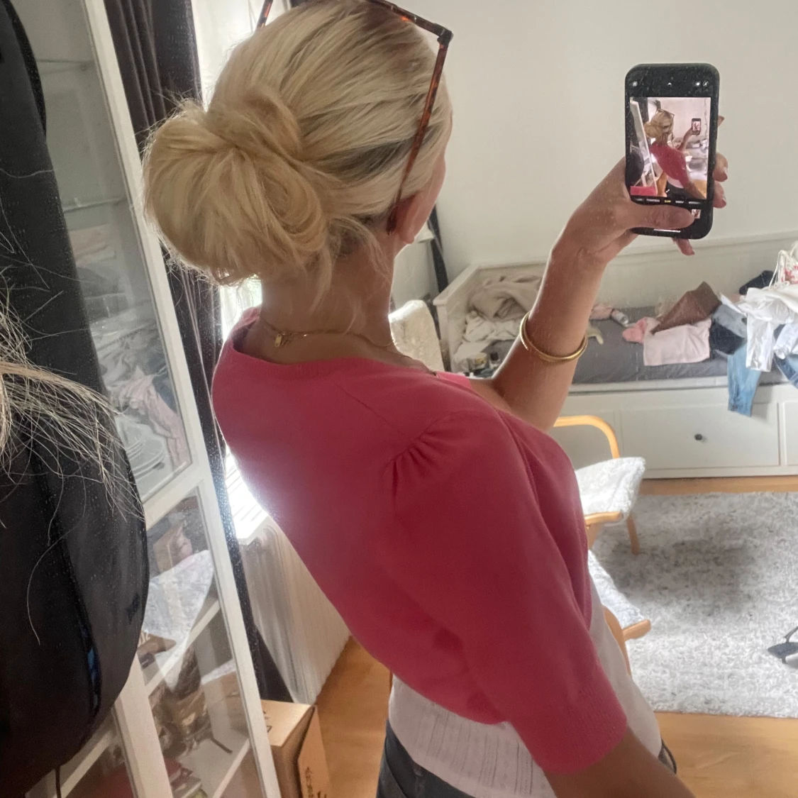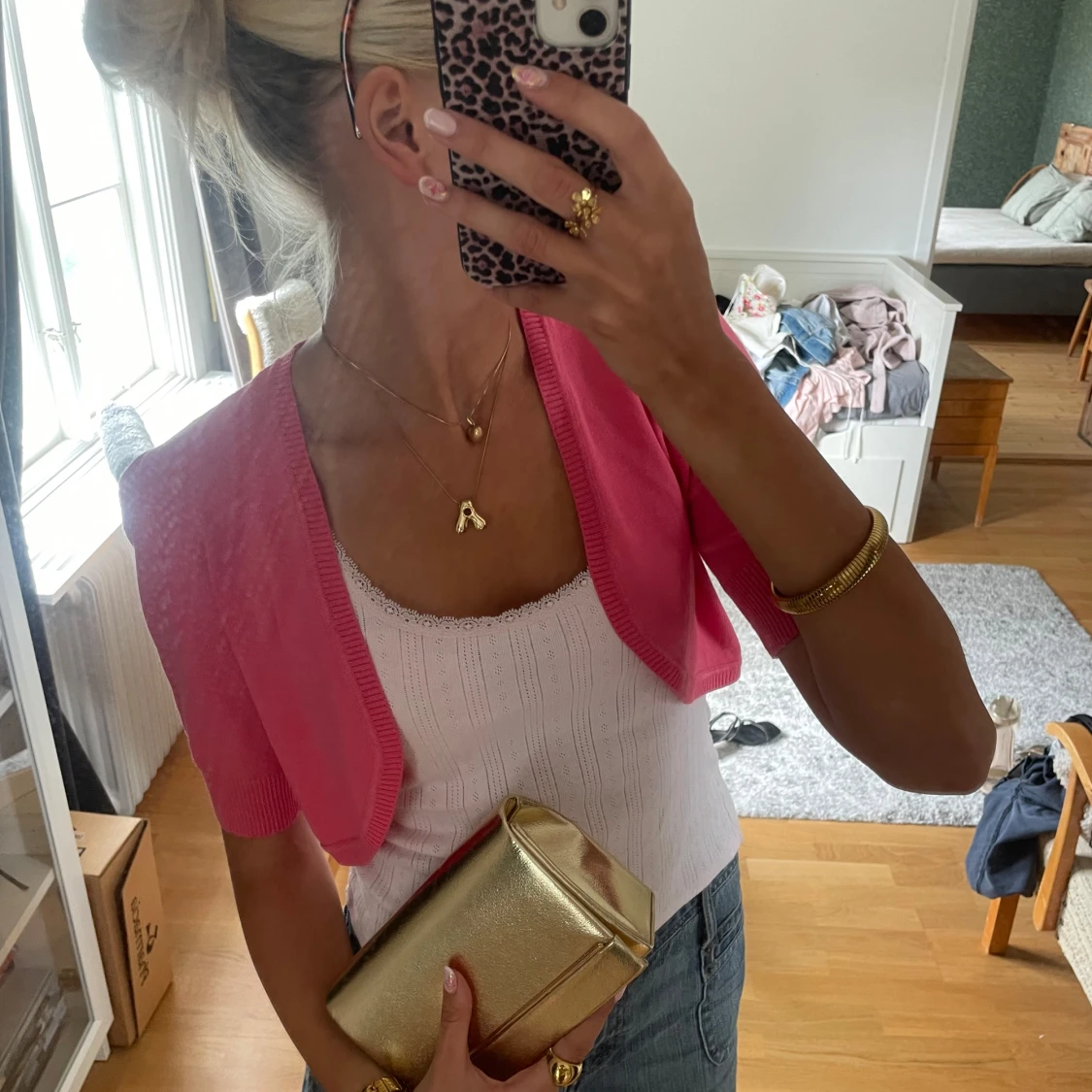Säljer en söt, kort rosa stickad bolero med halvlånga ärmar och ribbade kanter. Boleron har en öppen front och en figurnära passform som ger en fräsch och trendig look. Perfekt att slänga över ett linne eller t-shirt för en färgklick i outfiten.