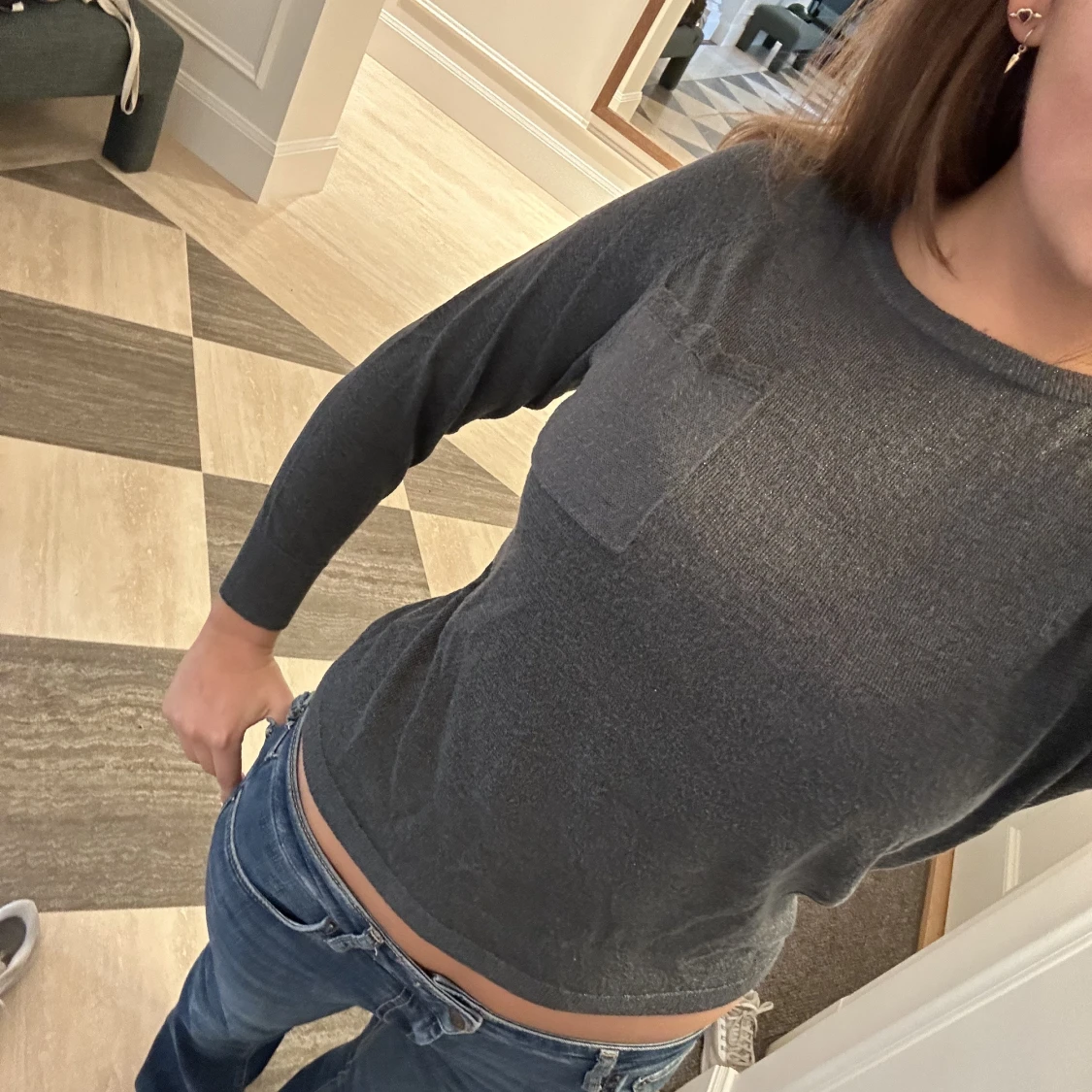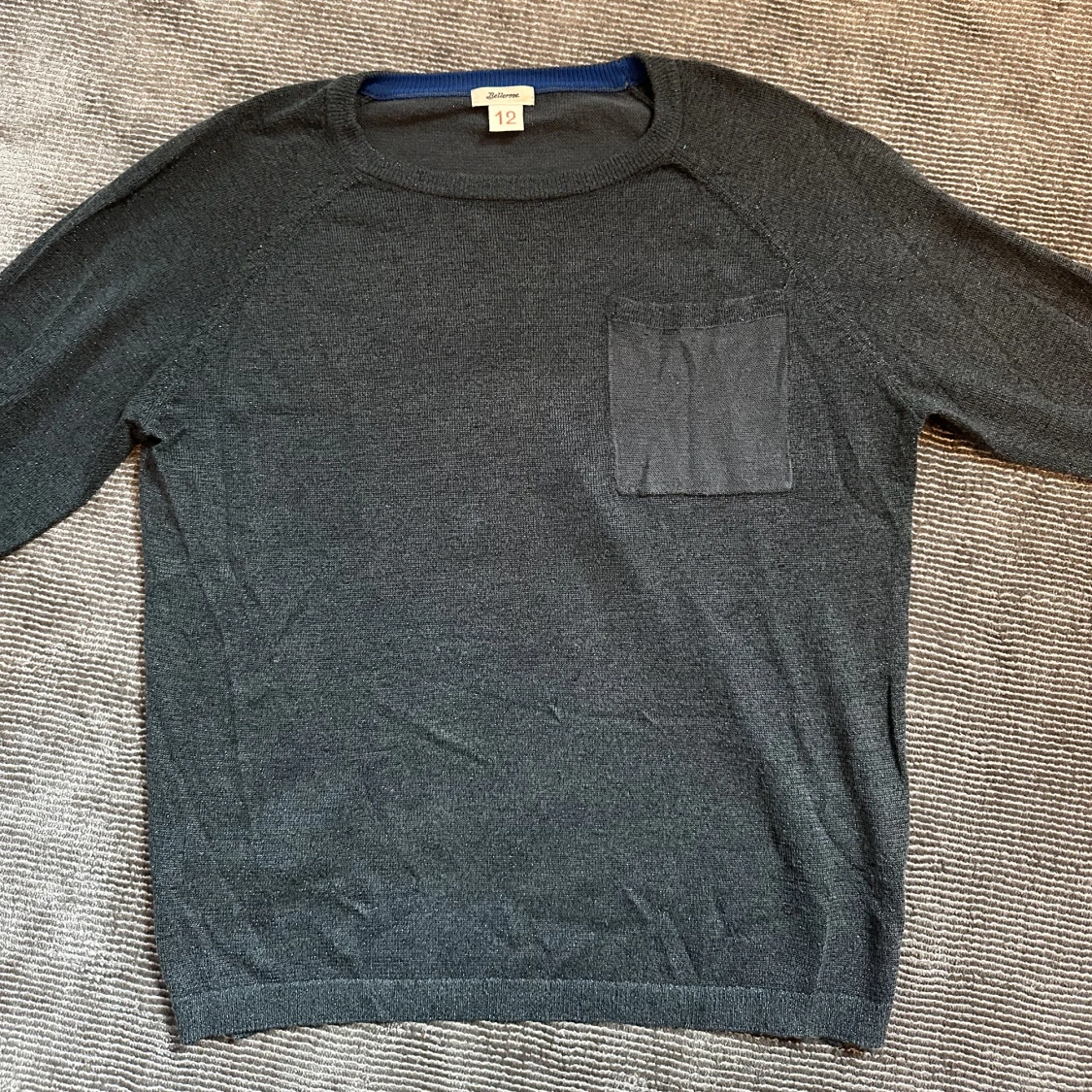 Detta är en superfin grönglittrig tröja med en liten ficka. Den är superfin och mjuk och relativt tunn och luftig. Är i storlek 12 men kan även användas som en snygg kortare topp. Mycket bra kvalitet och endast använd ett fåtal gånger, köpt för ca 700kr❤️❤️