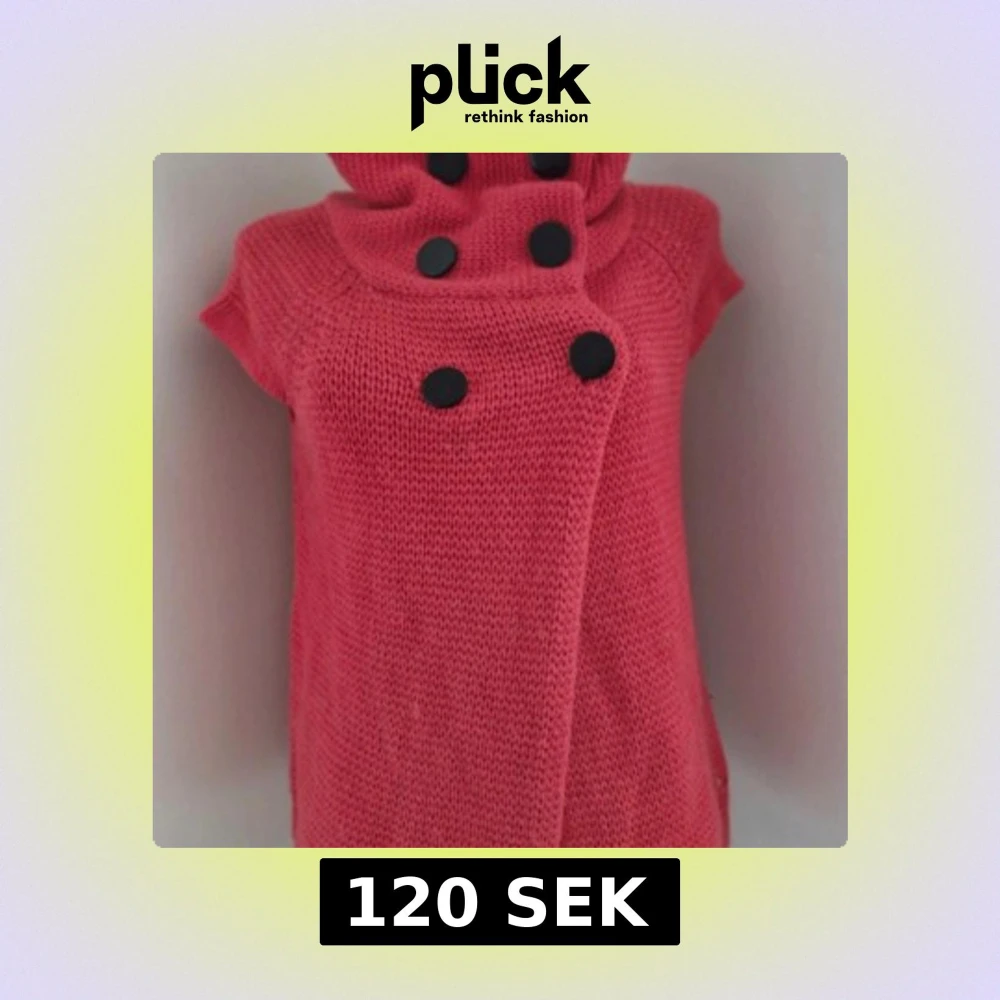 Säljer en mysig rosa stickad kofta med stora svarta knappar. Koftan har en unik design med korta ärmar och en hög krage som kan vikas ner. Perfekt för att hålla sig varm och stilren.