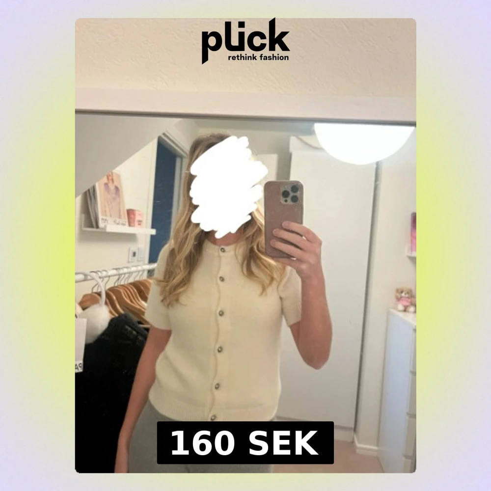 Säljer en söt och enkel beige kofta med korta ärmar och rund hals. Koftan har knappar hela vägen framtill och är stickad i mjukt material.