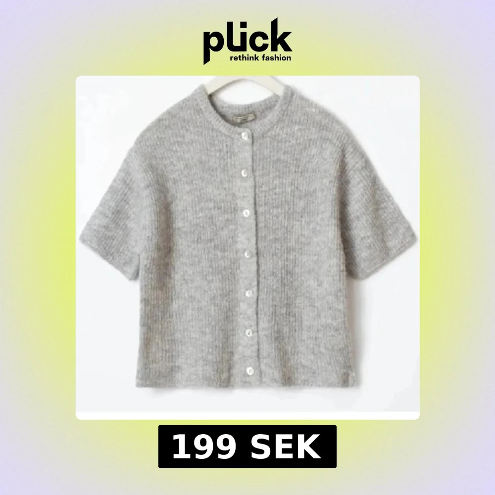 Grå kofta med korta ärmar och rund hals. Koftan har vita knappar hela vägen framtill och en avslappnad, boxig passform.