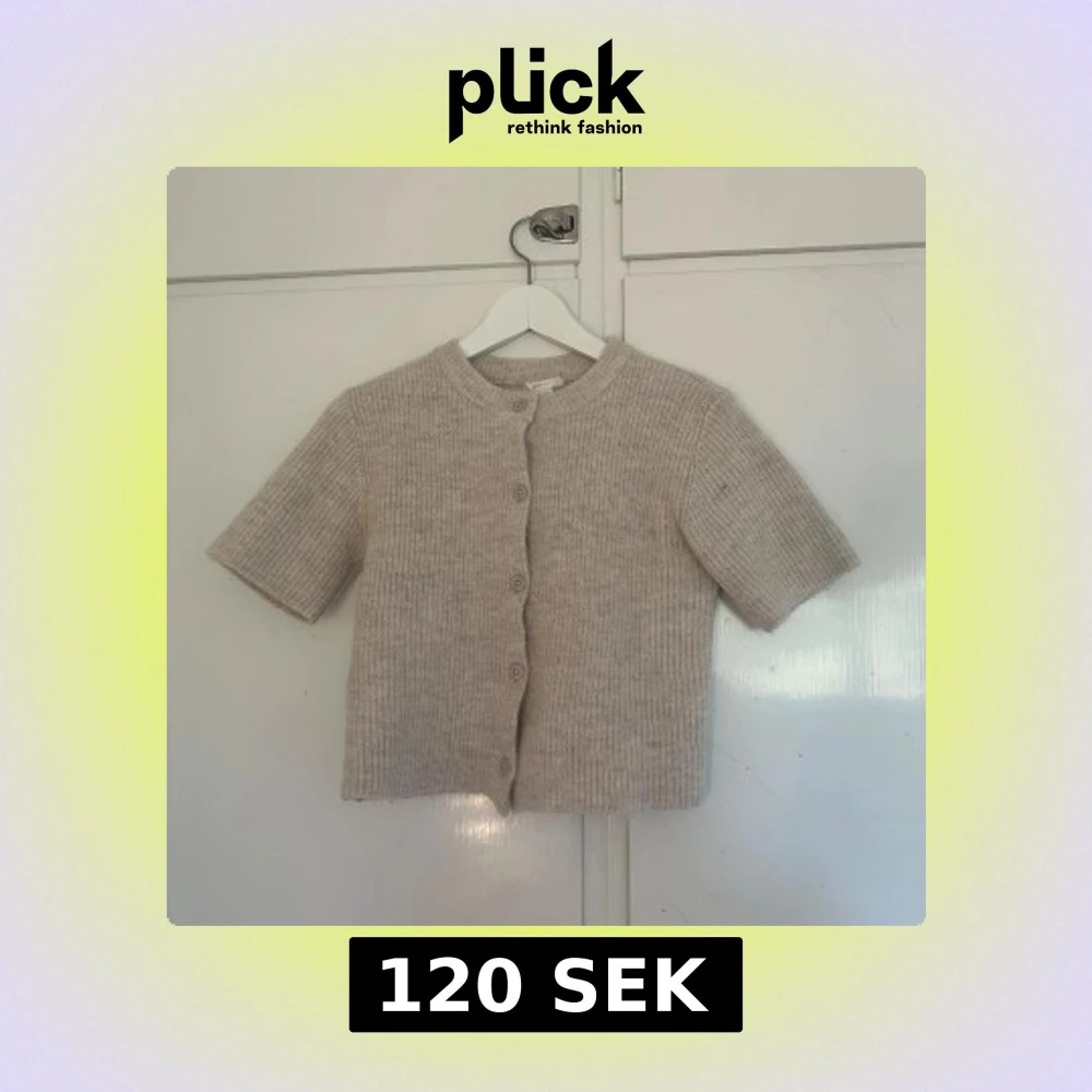 Säljer en beige, med korta ärmar och rund hals. Koftan har knappar framtill och är croppad i modellen. Perfekt för lager-på-lager och enkel att matcha med olika outfits.