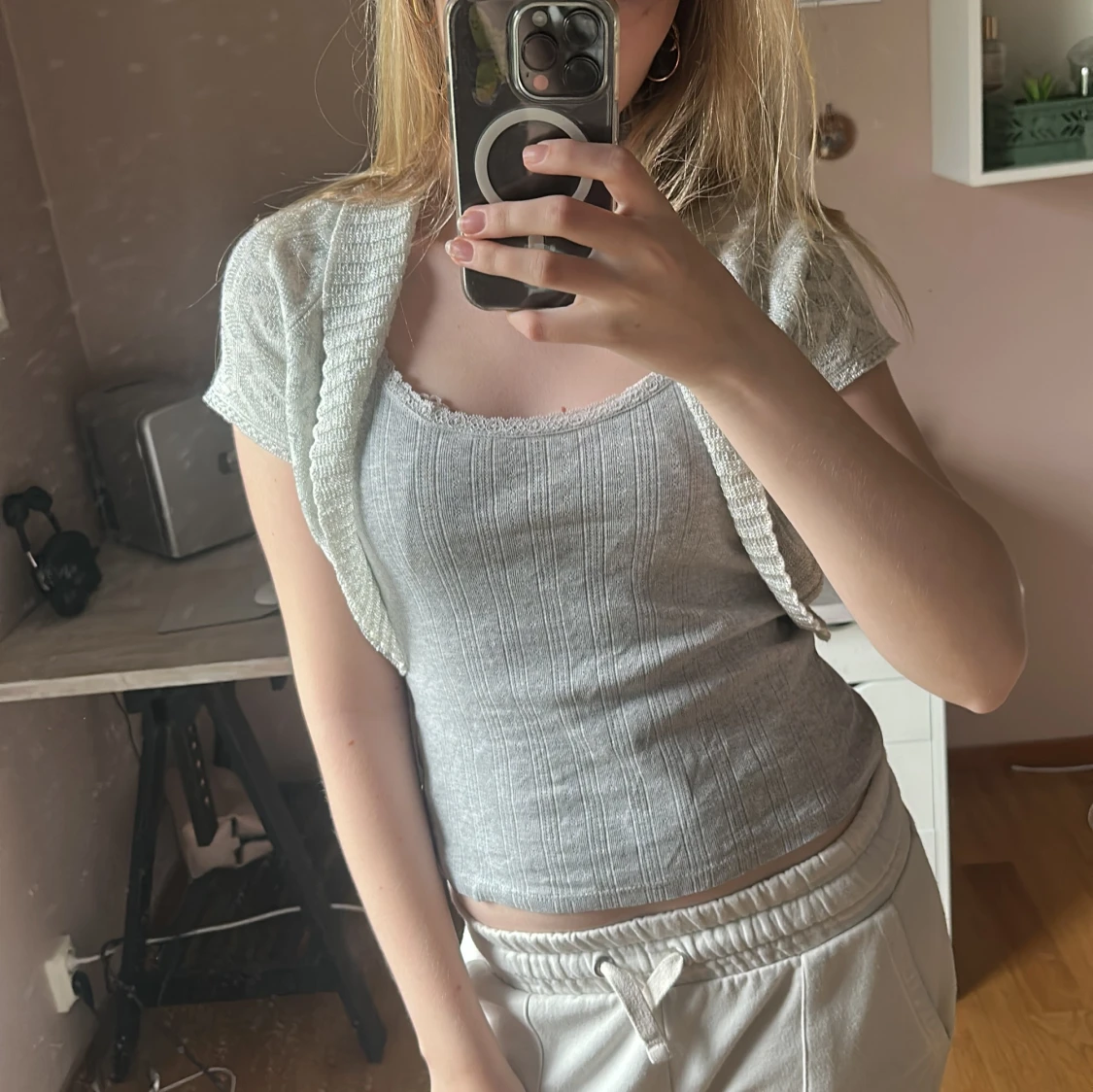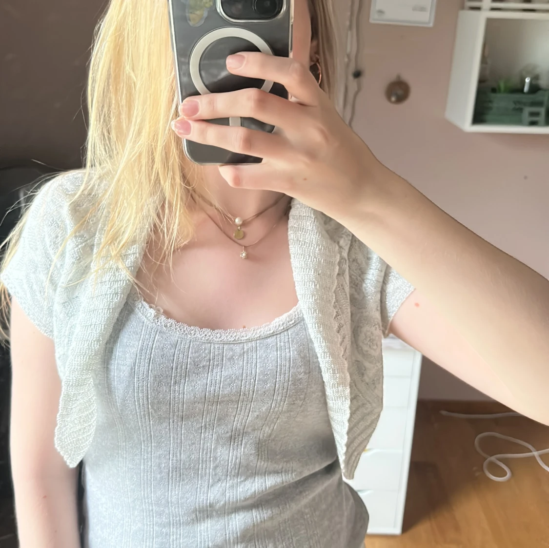 Jätte fin bolero som är grå med silver detaljer i stl M men mer åt S hållet, säljer för det inte kommer till användning längre 😢🩷🩷