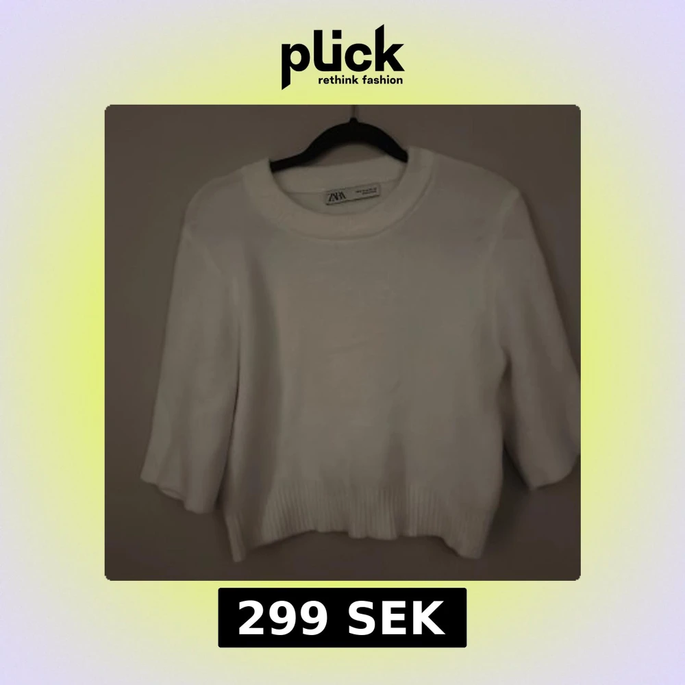 Säljer en stilren vit stickad tröja från Zara. Tröjan har trekvartsärmar och en rund halsringning. Perfekt för en avslappnad och trendig look.