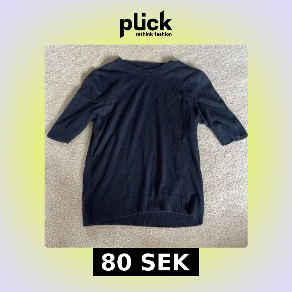 En svart stickad tröja från 157 med ribbade detaljer vid hals, ärmslut och nederkant. Tröjan har halvlånga ärmar och en klassisk rund halsringning. Säljer då jag aldieg använd den