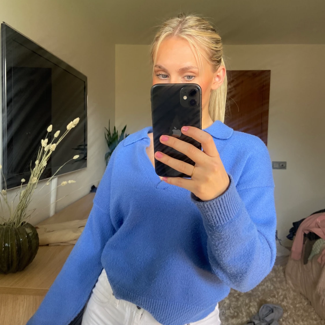Blå mjuk stickad tröja med krage från Zara. Storlek S.