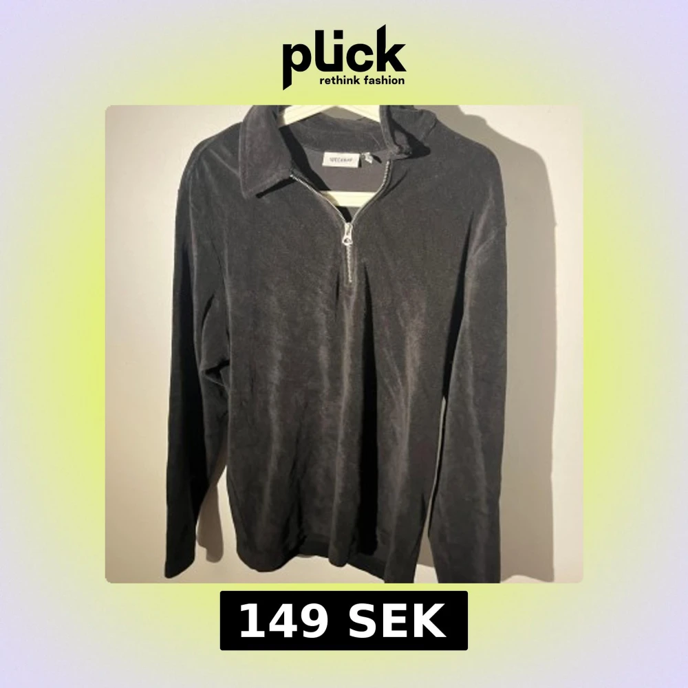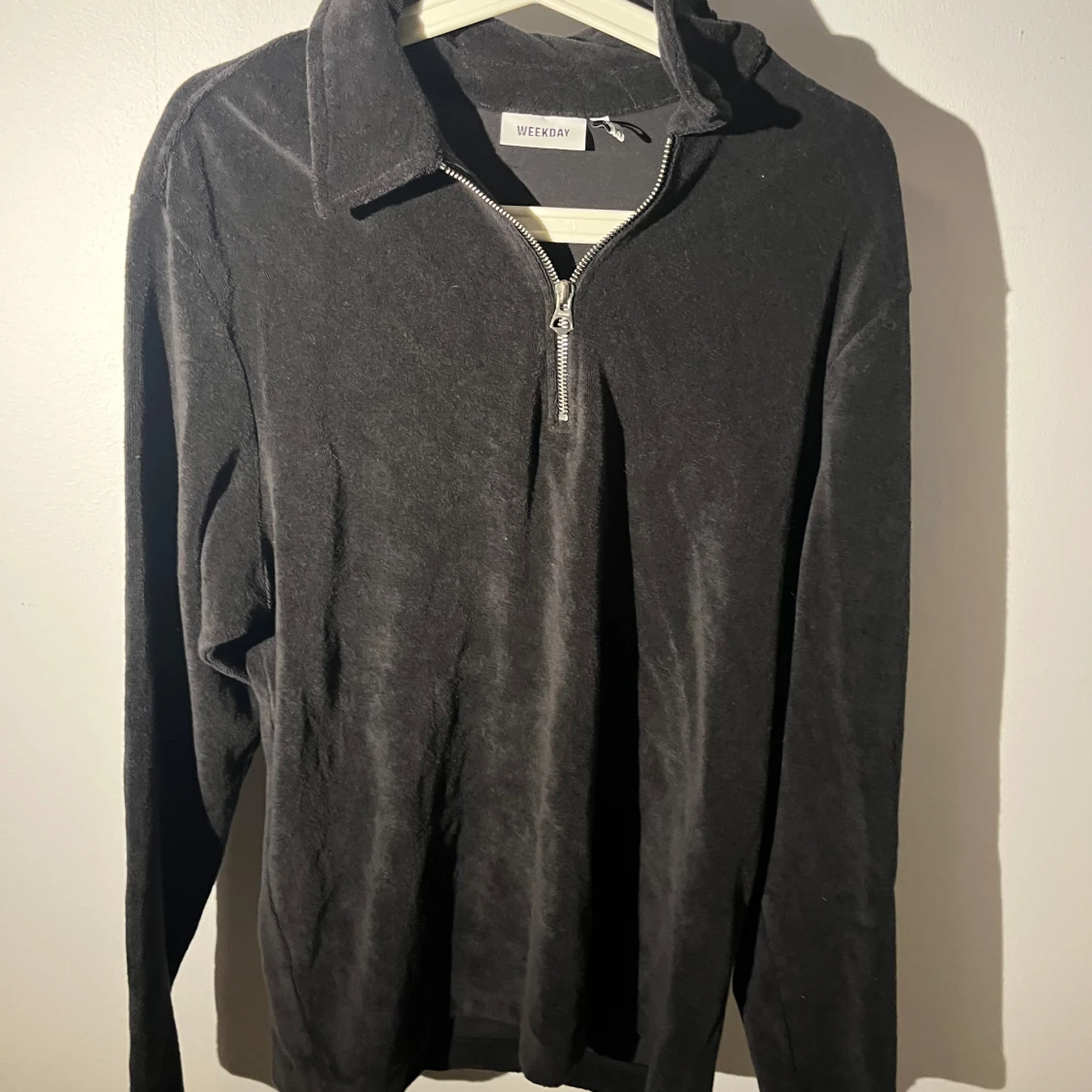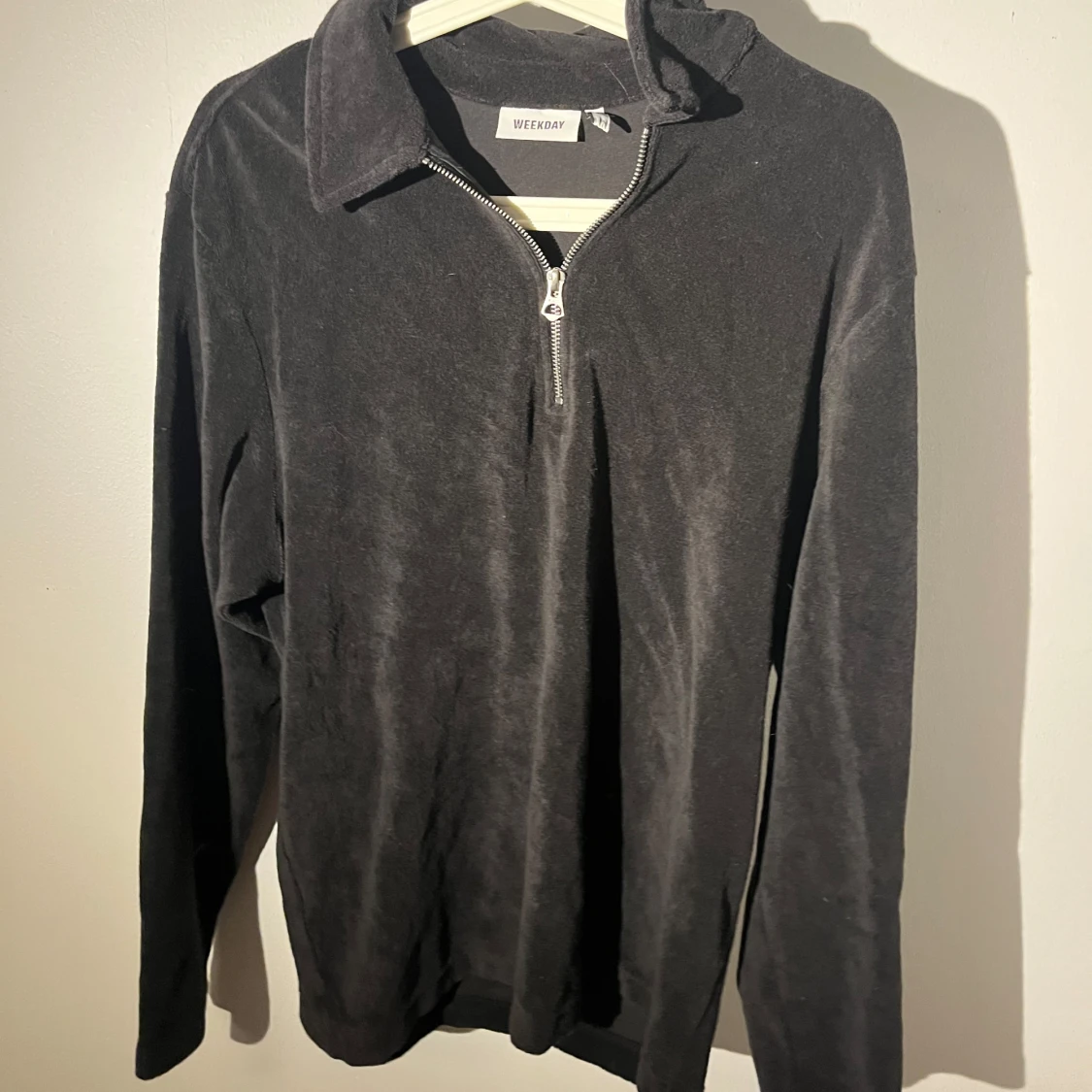 Svart långärmad tröja från Weekday i mjukt material med halv dragkedja framtill och klassisk krage. Perfekt för dig som gillar chill och stilren vibe. Passformen är normal och materialet känns skönt mot huden. Denna tröja är använd en gång.