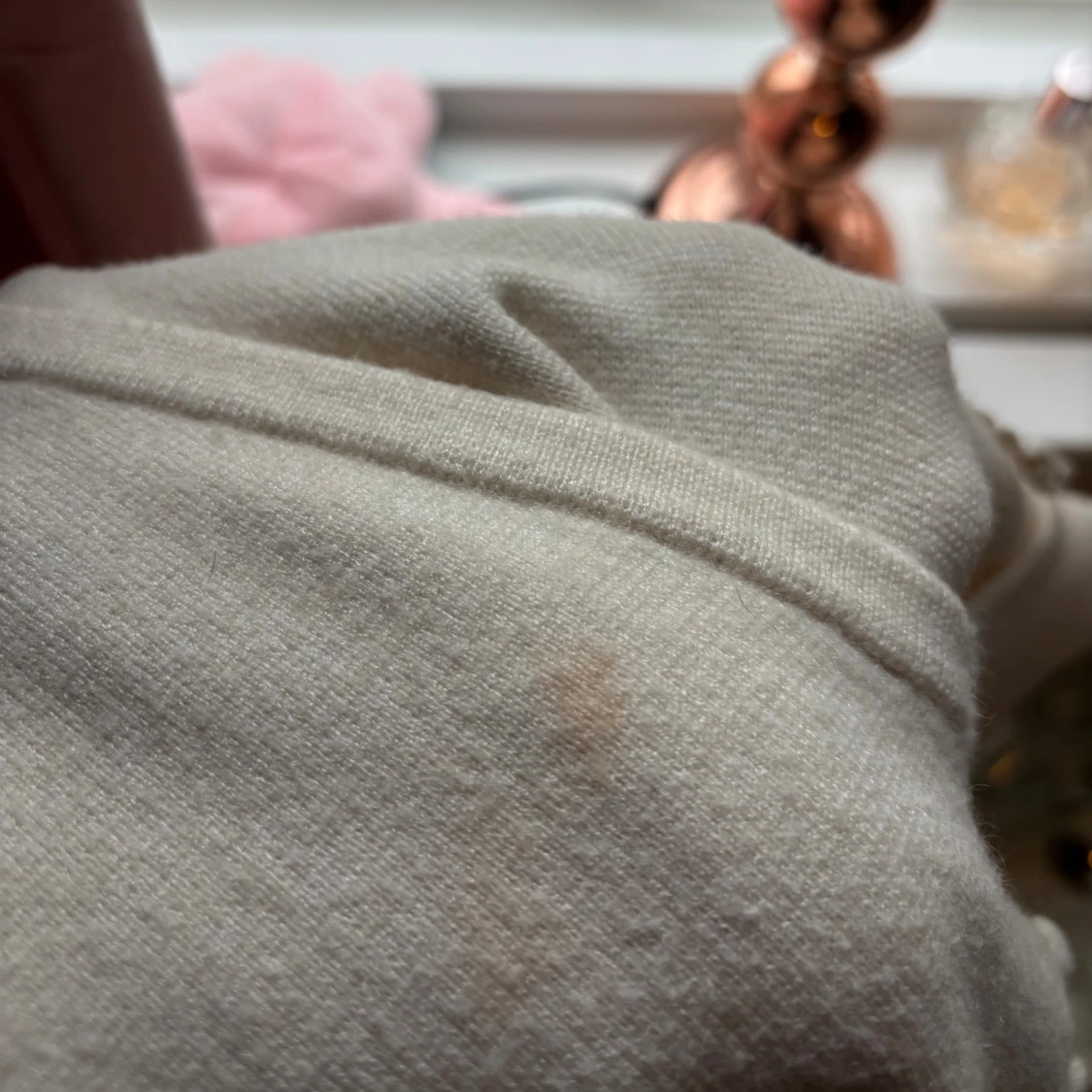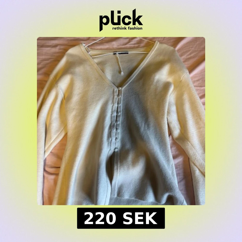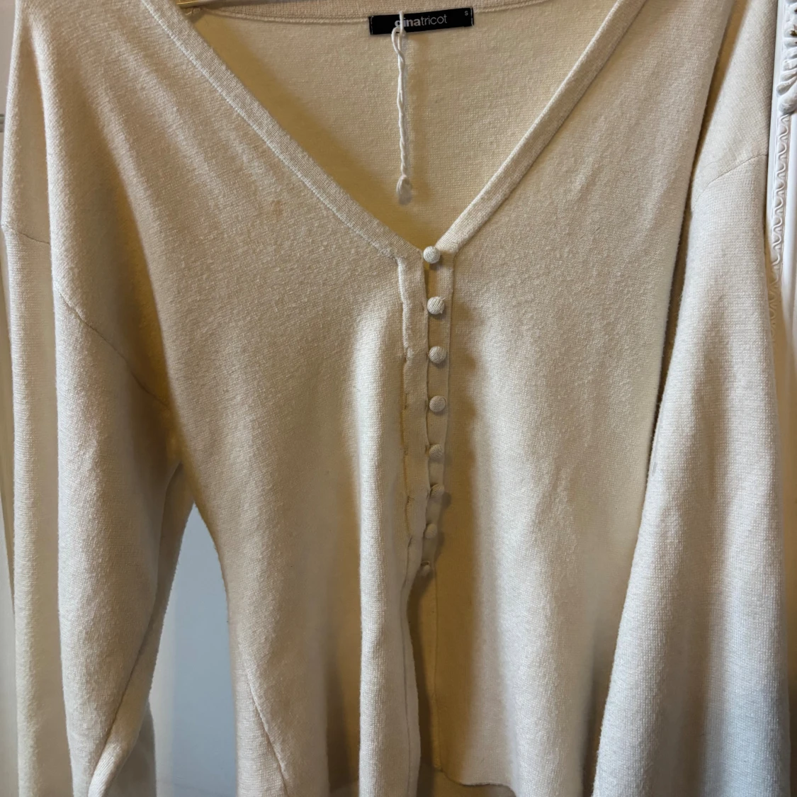 Kräm vit kofta från Gina Tricot med v-ringning och klädda knappar framtill. Långärmad och i mjukt material som känns skönt mot huden. Perfekt att slänga över en topp. Tröjan har dock en liten knappt synlig fläck som säkert enkelt går bort med fläckborttagning. Tröjan passar dig som har storleken S till L💞
