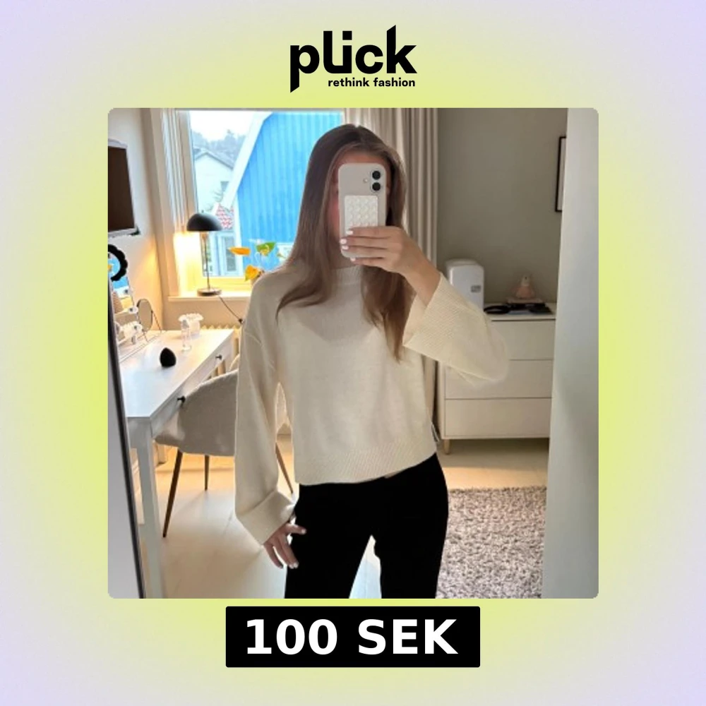 Säljer en krämvit stickad tröja med croppad passform och långa ärmar. Tröjan har en enkel design med ribbade muddar vid ärmslut och nederkant.