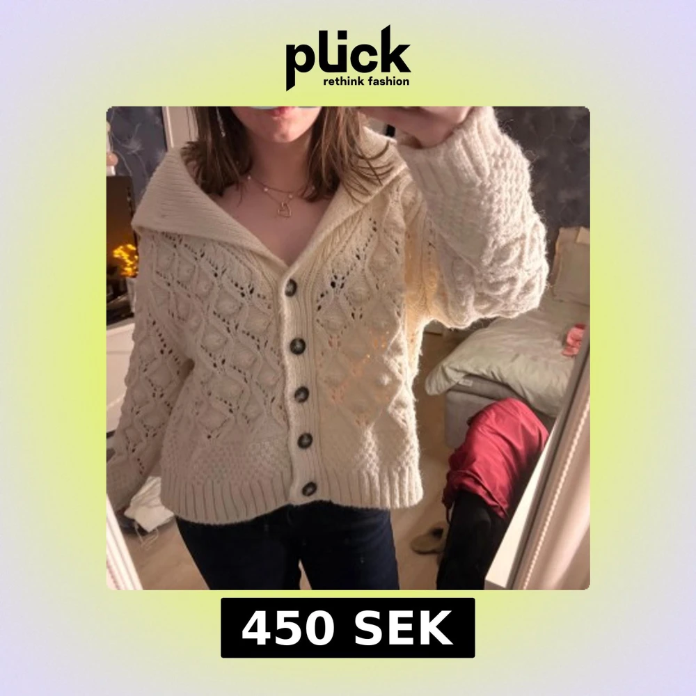 Supermysig krämvit stickad kofta med grovt mönster och stora knappar framtill. Koftan har en bred krage och långärmade ärmar med ribbade muddar
