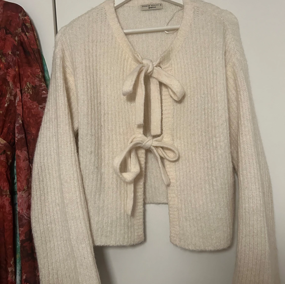 Supermysig krämvit stickad kofta från Twisted Gallery med två stora knytband framtill. Koftan har ribbad struktur och långa ärmar, perfekt för lager-på-lager och chill dagar. Snygg att matcha med jeans eller kjol för en soft look.