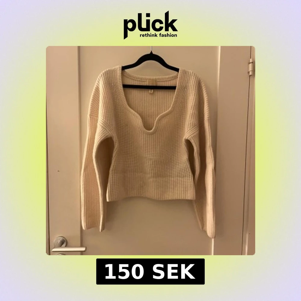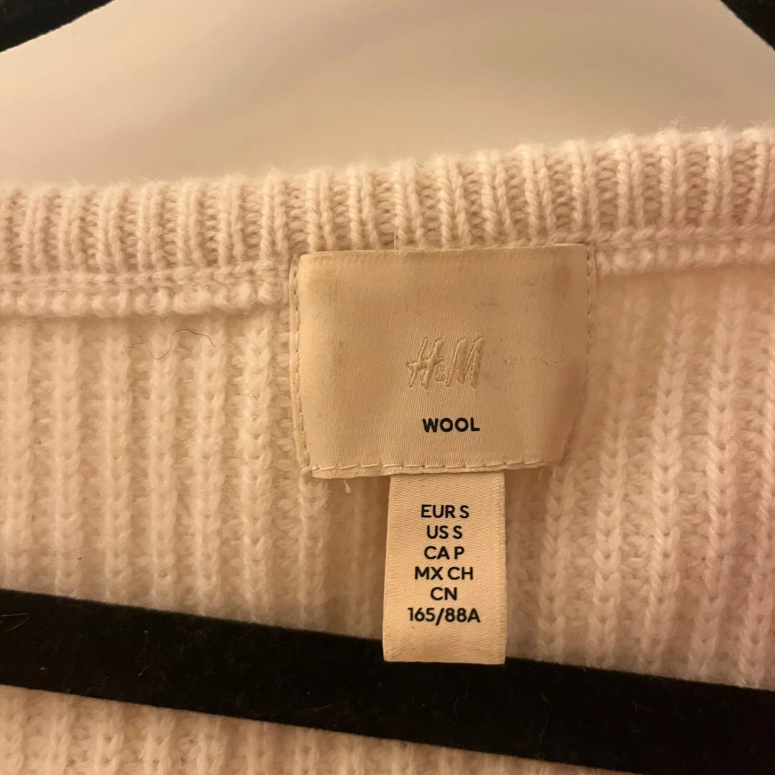 Säljer en krämvit stickad tröja från H&M i ull. Tröjan har en djup v-ringad hals och ribbad struktur som ger en snygg och modern look. Långärmad och med normal passform, perfekt för att hålla sig varm under kyliga dagar.