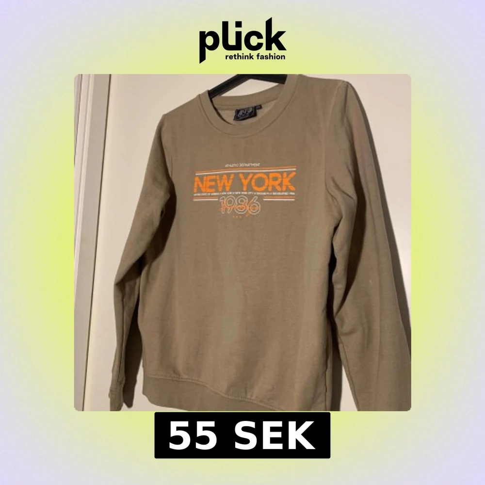 Säljer en beige sweatshirt från OTP med orange och vitt tryck på bröstet där det står 'NEW YORK 1986'. Tröjan har rund halsringning och långa ärmar. Perfekt för en avslappnad stil.